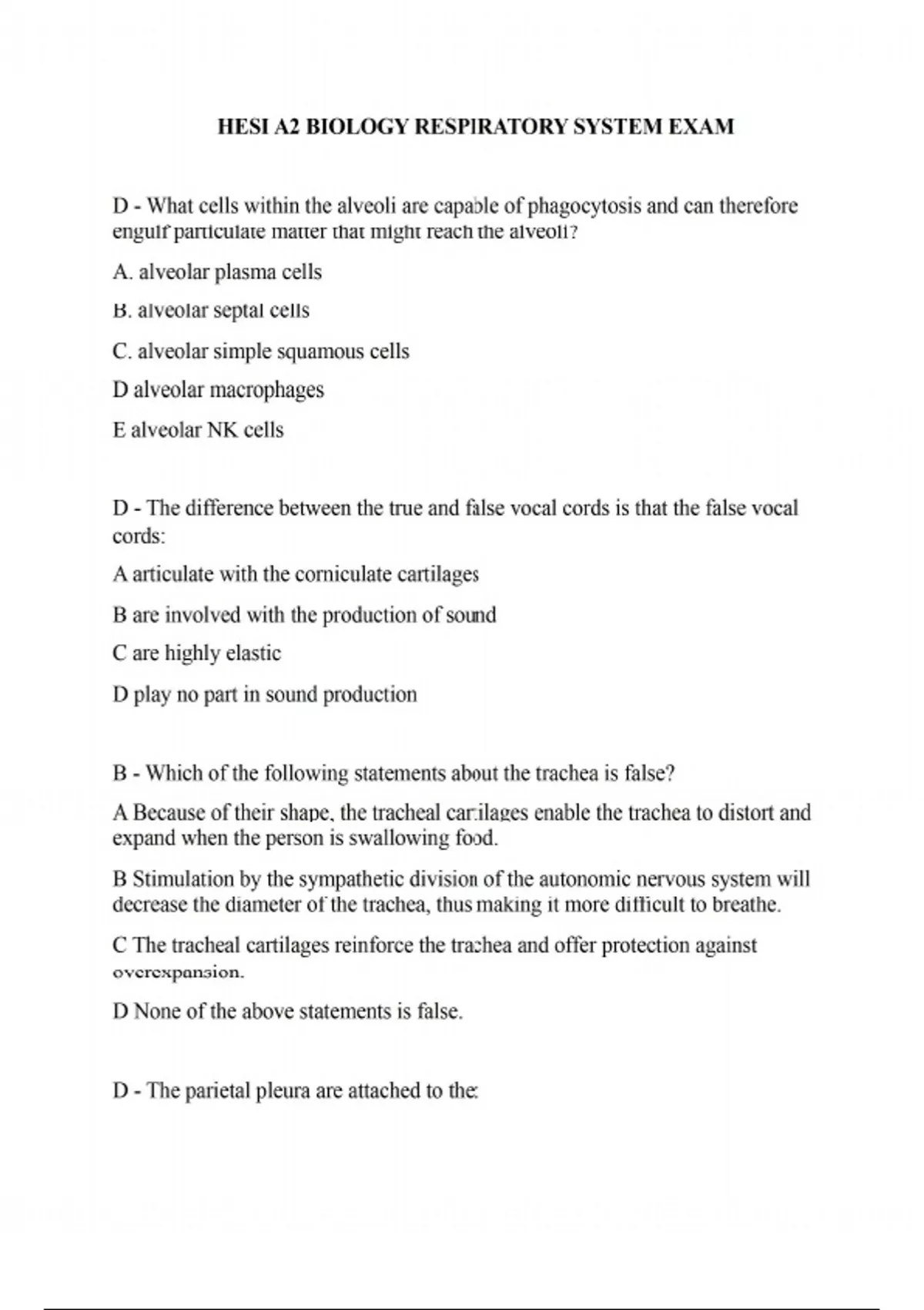 D - What cells within the alveoli are capable of phagocytosis and can therefore engulf particulate matter that might reach the alveoli? A. alveolar plasma cells B. alveolar septal cells C. alveolar simple squamous cells D alveolar macrophages E alveolar NK cells D - The difference between the true and false vocal cords is that the false vocal cords: A articulate with the corniculate cartilages B are involved with the production of sound C are highly elastic D play no part in sound production B - Which of the following statements about the trachea is false? A Because of their shape, the tracheal cartilages enable the trachea to distort and expand when the person is swallowing food. B Stimulation by the sympathetic division of the autonomic nervous system will decrease the diameter of the trachea, thus making it more difficult to breathe. C The tracheal cartilages reinforce the trachea and offer protection against overexpansion. D None of the above statements is false. D - The parietal pleura are attached to the: A inner thoracic body wall B mediastinum C superior surface of the diaphragm D all of the above C - During internal respiration, the exchange of the respiratory gases takes place between which of the following? A. the pulmonary capillaries and the interstitial fluid that surrounds the cells B. the pulmonary capillaries and the air within the alveoli C. the systemic capillaries and the interstitial fluid that surrounds the cells D. all of the above B - During quiet breathing, the diaphragm and external intercostals muscles contract. What effect does this have on the thoracic cavity? A decreases the volume and decreases the pressure of the thoracic cavity B increases the volume and decreases the pressure of the thoracic cavity C increases the pressure and decreases the volume of the thoracic cavity D increases the volume and increases the pressure of the thoracic cavity A - During expiration there is a(n): A increase in intrapulmonary pressure B decrease in intrapulmonary pressure C increase in atmospheric pressure D increase in the volume of the lungs