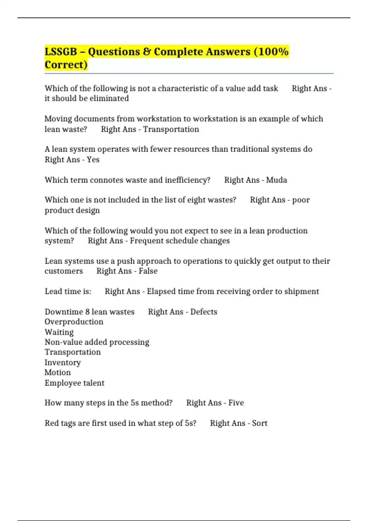 Downtime 8 lean wastes Right Ans - Defects