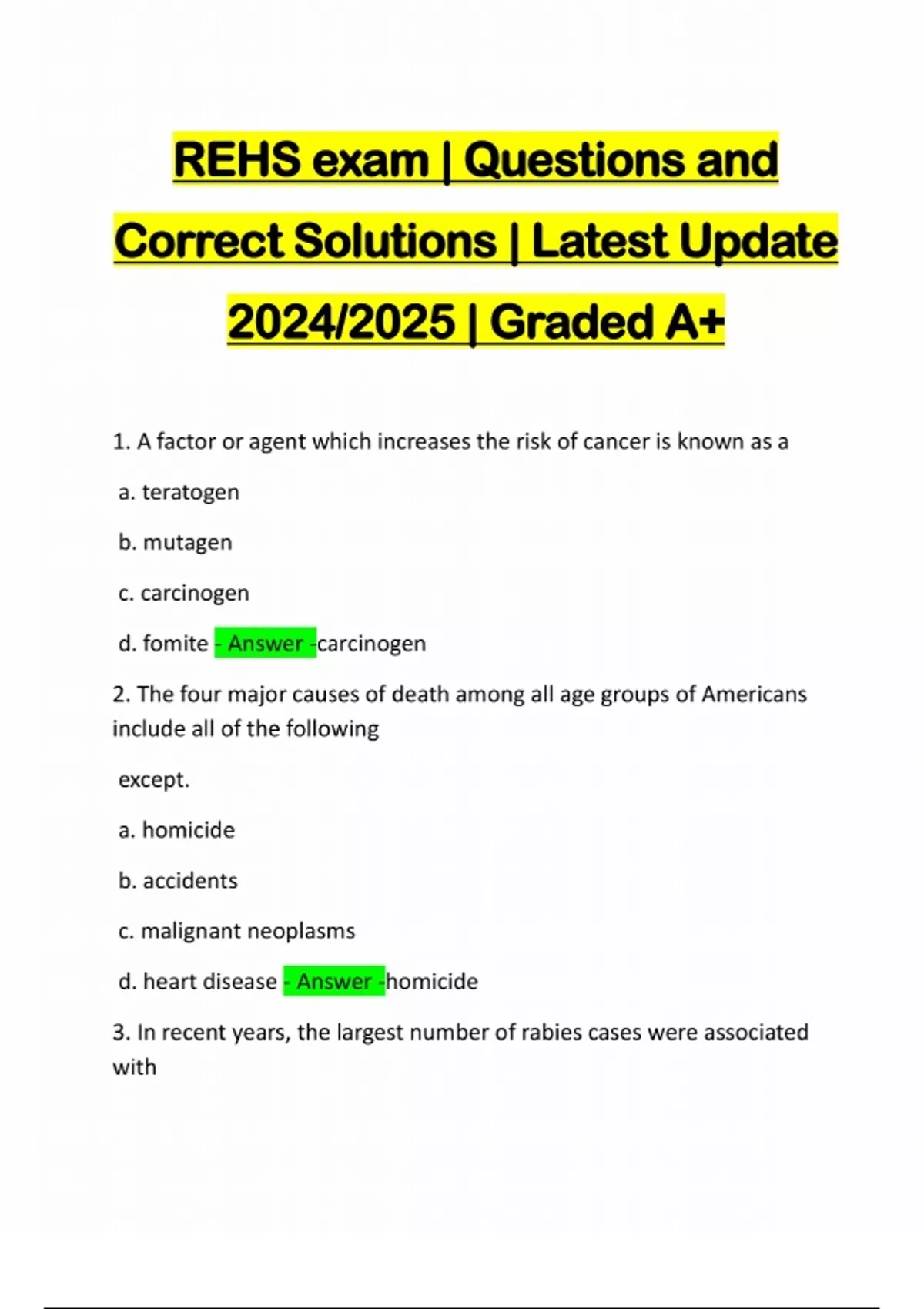 REHS exam | Questions and Correct Solutions | Latest Update 2024/2025 | Graded A+ 1. A factor or agent which increases the risk of cancer is known as a a. teratogen b. mutagen c. carcinogen d. fomite - Answer -carcinogen 2. The four major causes of death among all age groups of Americans include all of the following except. a. homicide b. accidents c. malignant neoplasms d. heart disease - Answer -homicide 3. In recent years, the largest number of rabies cases were associated witha. skunks b. bats c. dogs d. raccons. - Answer -skunks 4. Asbestosis is caused by fine silicate fibers retained in the a. kidneys b. lungs c. colon d. abdomen - Answer -lungs 5. An illness due to a specific infectious agent or its toxic product which is transmitted from a reservoir to a susceptible host either directly or indirectly is calle
