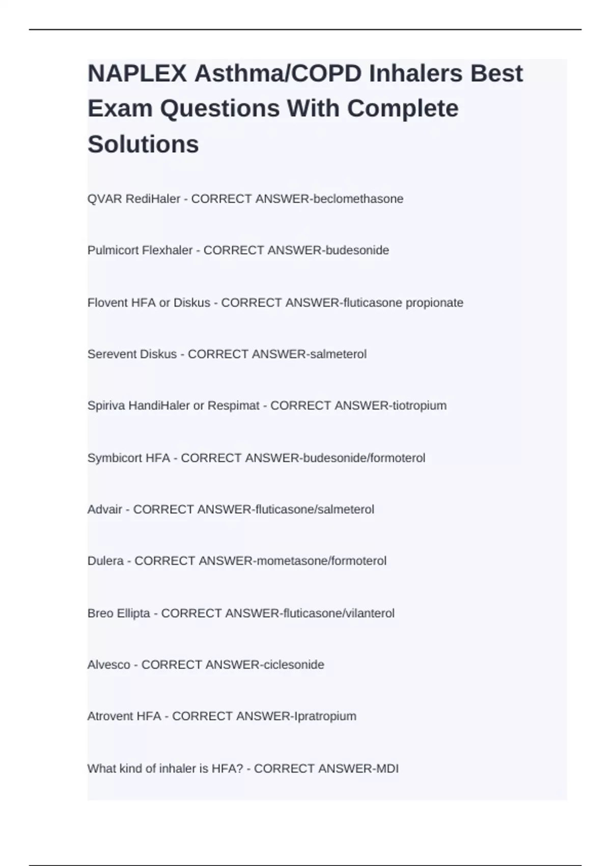 What kind of inhaler is HFA? - CORRECT ANSWER-MDI