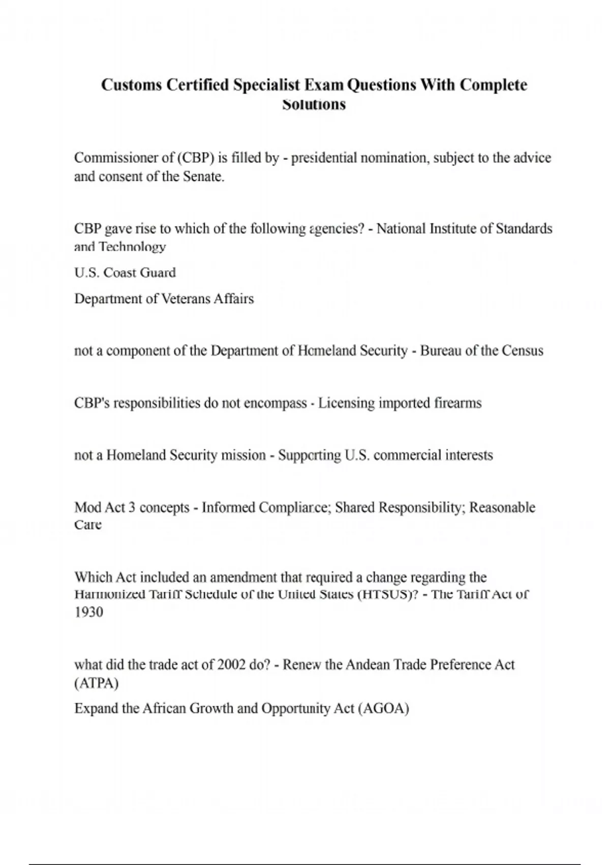 Customs Certified Specialist Exam Questions With Complete Solutions