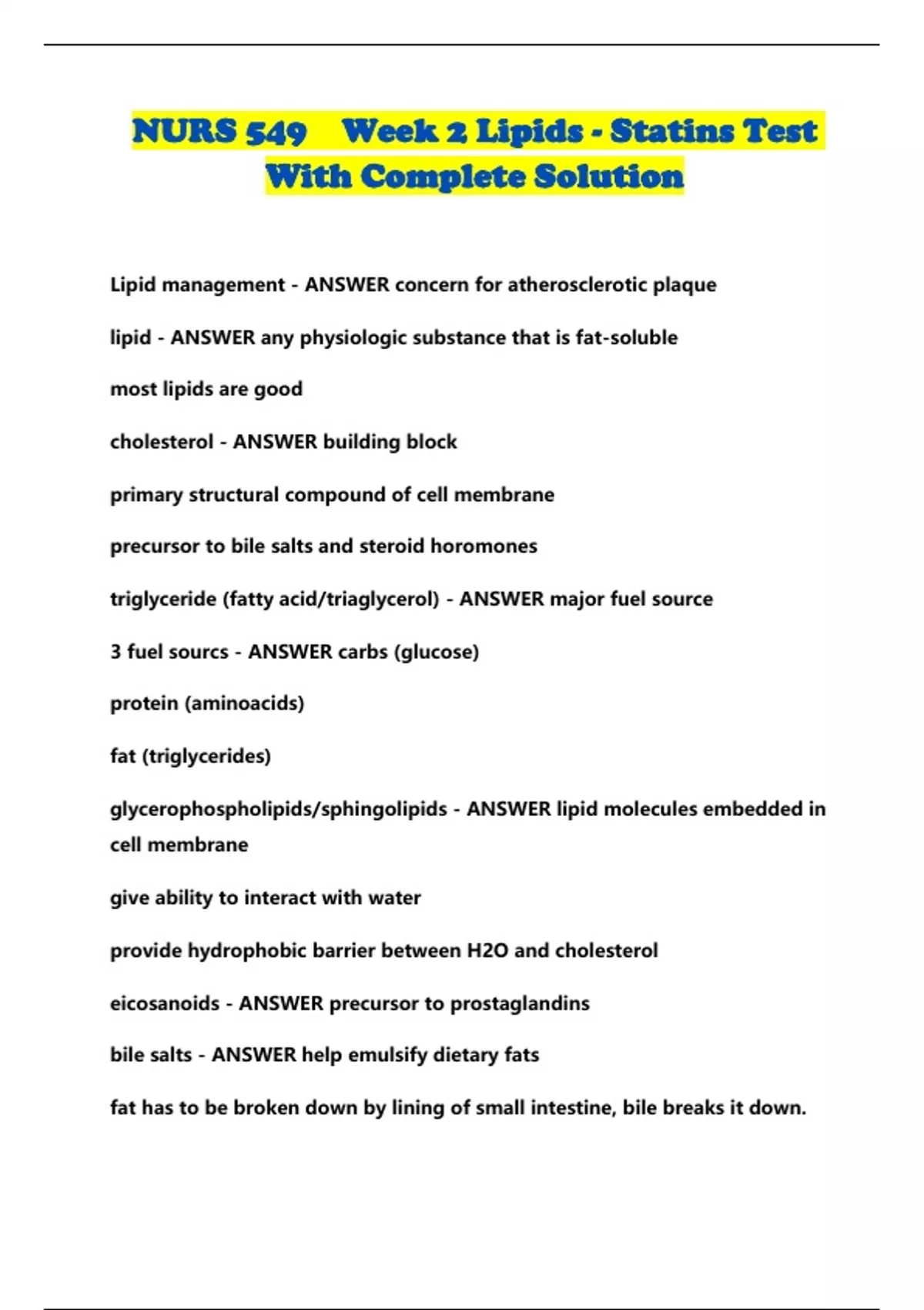 NURS 549 Week 2 Lipids - Statins Test With Complete Solution...