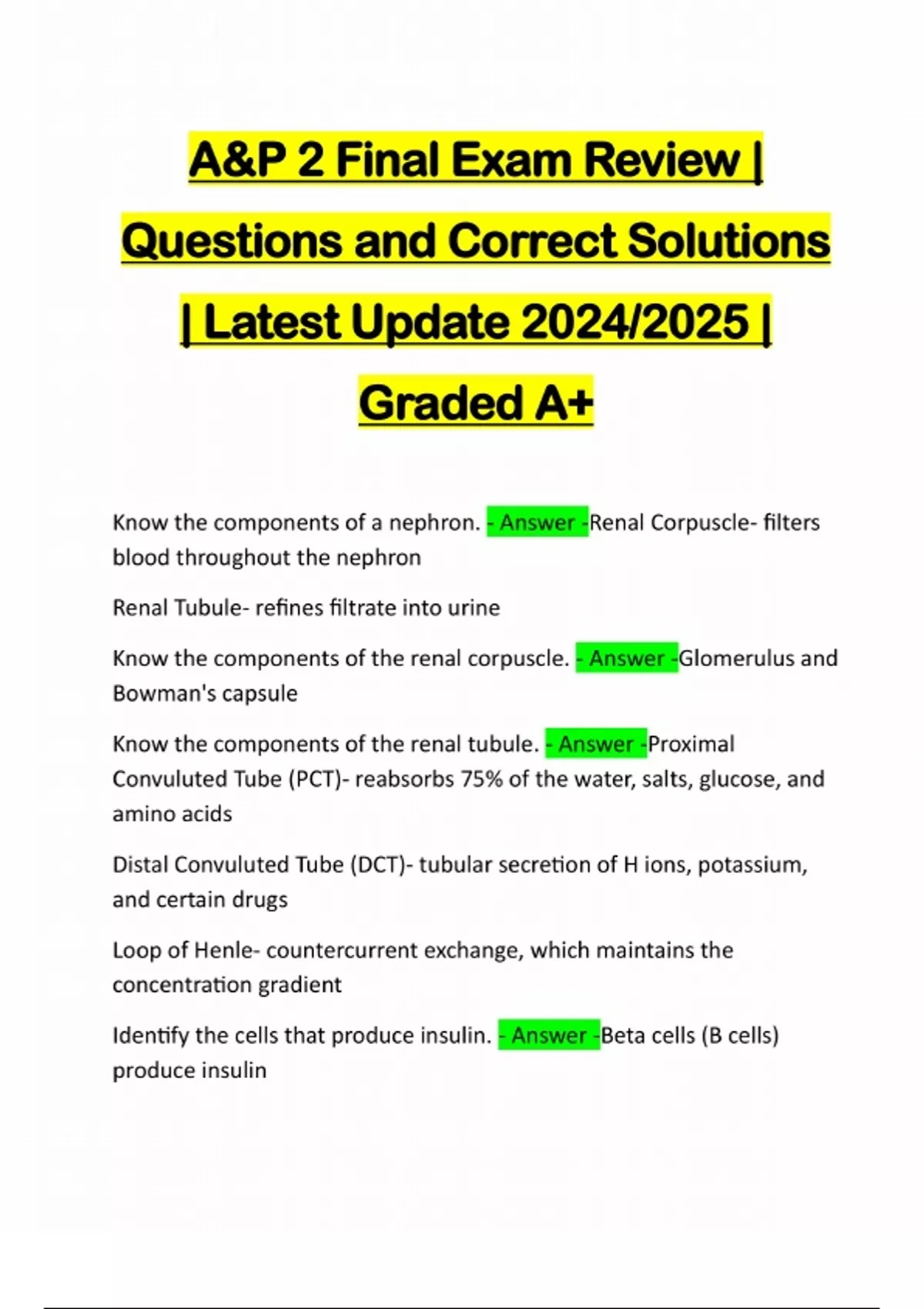 A&P 2 Final Exam Review | Questions and Correct Solutions | Latest Update 2024/2025 | Graded A+ Know the components of a nephron. - Answer -Renal Corpuscle- filters blood throughout the nephron Renal Tubule- refines filtrate into urine Know the components of the renal corpuscle. - Answer -Glomerulus and Bowman's capsule Know the components of the renal tubule. - Answer -Proximal Convuluted Tube (PCT)- reabsorbs 75% of the water, salts, glucose, and amino acids Distal Convuluted Tube (DCT)- tubular secretion of H ions, potassium, and certain drugs Loop of Henle- countercurrent exchange, which maintains the concentration gradient Identify the cells that produce insulin. - Answer -Beta cells (B cells) produce insulinIdentify the cells that produce calcitonin. - Answer -Calcitonin is produced and secreted by parafollicular cells (C cells) of the thyroid gland Know the stimulus for release of insulin. - Answer -High blood sugar levels Identify the cells that produce glucagon. - Answer -Glucagon is produced and secreted by Alpha cells (A cells) Know the stimulus for release of glucagon. - Answer -When g