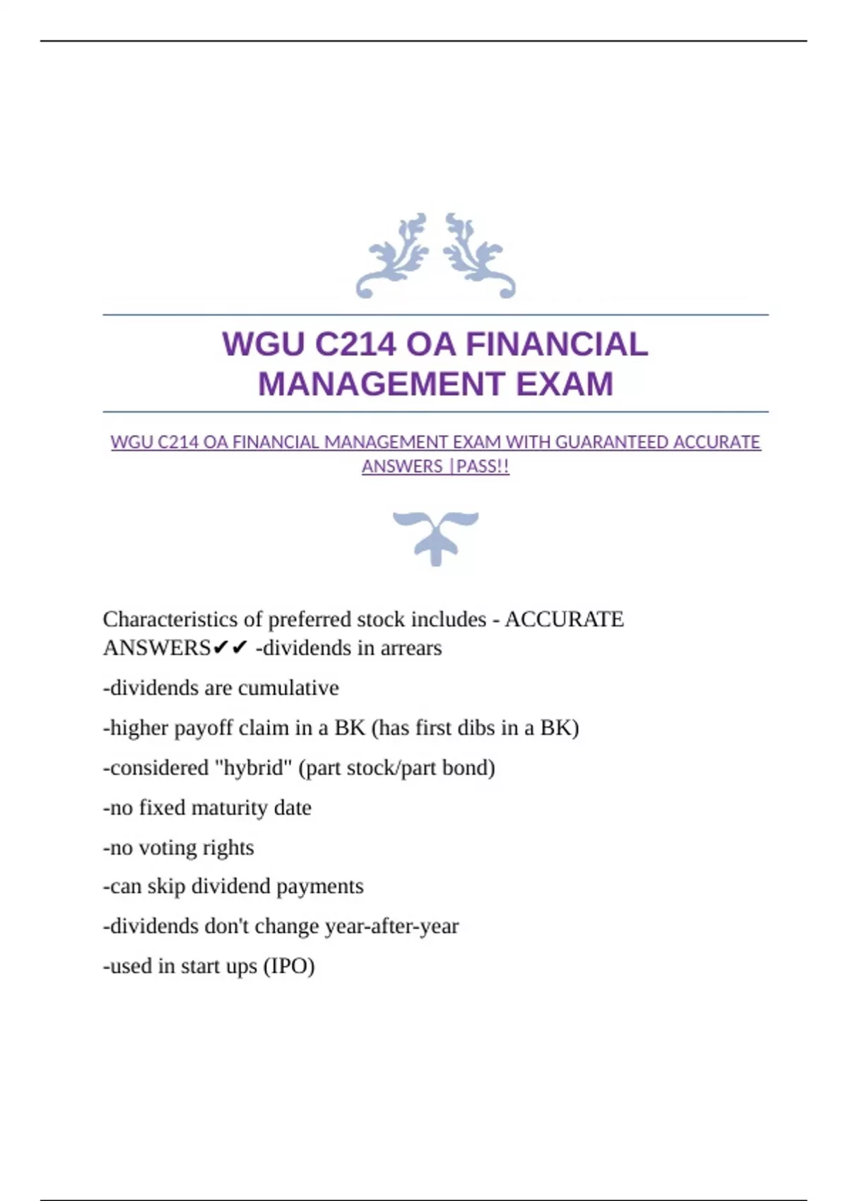 WGU C214 OA FINANCIAL MANAGEMENT EXAM WITH GUARANTEED ACCURATE