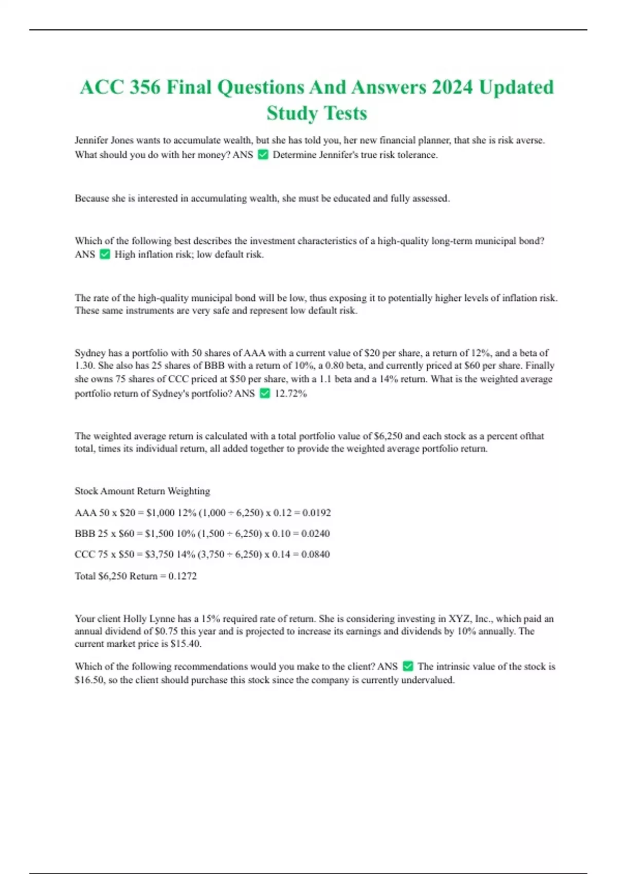 1.30. She also has 25 shares of BBB with a return of 10%, a 0.80 beta, and currently priced at $60 per share. Finally