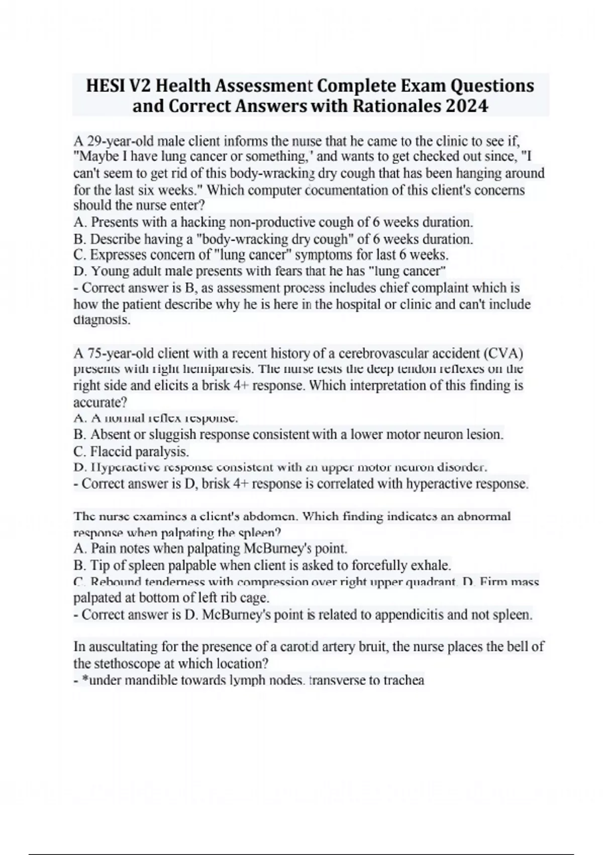 A 29-year-old male client informs the nurse that he came to the clinic to see if, "Maybe I have lung cancer or something," and wants to get checked out since, "I can't seem to get rid of this body-wracking dry cough that has been hanging around for the last six weeks." Which computer documentation of this client's concerns should the nurse enter? A. Presents with a hacking non-productive cough of 6 weeks duration. B. Describe having a "body-wracking dry cough" of 6 weeks duration. C. Expresses concern of "lung cancer" symptoms for last 6 weeks. D. Young adult male presents with fears that he has "lung cancer" - Correct answer is B, as assessment process includes chief complaint which is how the patient describe why he is here in the hospital or clinic and can't include diagnosis. A 75-year-old client with a recent history of a cerebrovascular accident (CVA) presents with right hemiparesis. The nurse tests the deep tendon reflexes on the right side and elicits a brisk 4+ response. Which interpretation of this finding is accurate? A. A normal reflex response. B. Absent or sluggish response consistent with a lower motor neuron lesion. C. Flaccid paralysis. D. Hyperactive response consistent with an upper motor neuron disorder. - Correct answer is D, brisk 4+ response is correlated with hyperactive response. The nurse examines a client's abdomen. Which finding indicates an abnormal response when palpating the spleen? A. Pain notes when palpating McBurney's point. B. Tip of spleen palpable when client is asked to forcefully exhale. C. Rebound tenderness with compression over right upper quadrant. D. Firm mass palpated at bottom of left rib cage. - Correct answer is D. McBurney's point is related to appendicitis and not spleen. In auscultating for the presence of a carotid artery bruit, the nurse places the bell of the stethoscope at which location? - *under mandible towards lymph nodes. transverse to trachea HESI V2 Health Assessment Complete Exam Questions and Correct Answers with Rationales 2024 A male client arrives at the clinic for follow-up health assessment after recent antibiotic treatment for pneumonia without hospitalization. Which technique should the nurse implement to assess for adventitious lung sounds? A. Use the bell of the stethoscope to listen to the lung fields over lower lobes. B. Have the client lay flat while listening to the anterior surface of the chest. C. Press the stethoscope's diaphragm firmly on the skin over each lung field. D. Shave all chest hair that may distort sounds heard through the diaphragm. - Correct answer is C. The nurse should listen to all lungs fields during assessment and move from side to side during auscultation. A client with streptococcus pharyngitis reports high fever, difficulty swallowing and a muffled voice. Which complication should the nurse suspect? A. Foreign body obstruction. B. Laryngeal polyps. C. Peritonsillar abscess. D. Nasal polyps - Correct answer is C. Since infections are associated with abscesses and pus. The nurse is obtaining a health history for a client prior to a scheduled cholecystectomy. While interviewing the client, which assessment technique should the nurse use when asking about the client's use of illegal drugs and alcohol? A. Obtain a drug using screen to verify legitimacy of client's stated history. B. Allow the client to decline answering social questions. C. Ask specifically about alcohol, marijuana, cocaine, her D. Use the term illegal or illicit to describe street drug. - Correct answer is C. When interviewing the patient, questions should be clear and specific. The nurse applies pressure over an area of the lower abdomen where the client reports pain. The client denies pain upon palpation, but reports pain when the pressure is released. What action should the nurse implement? A. Offer to administer a laxative prescribed for PRN use. B. Obtain a prescription to catheterize the client's bladder. C. Instruct the client in distraction and relation techniques. D. Notify the healthcare provider of the rebound tenderness. - Correct answer is D. As this could be a sign of appendicitis.