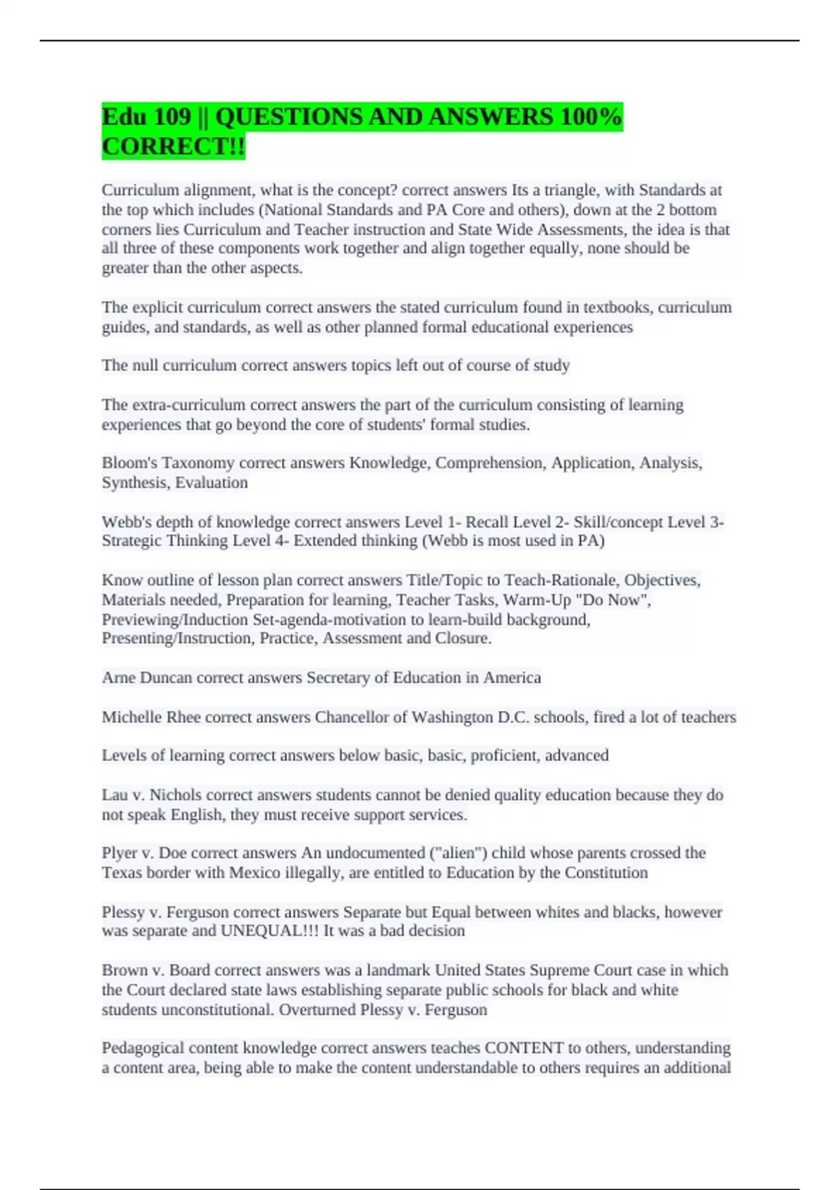 Pedagogical content knowledge correct answers teaches CONTENT to others, understanding