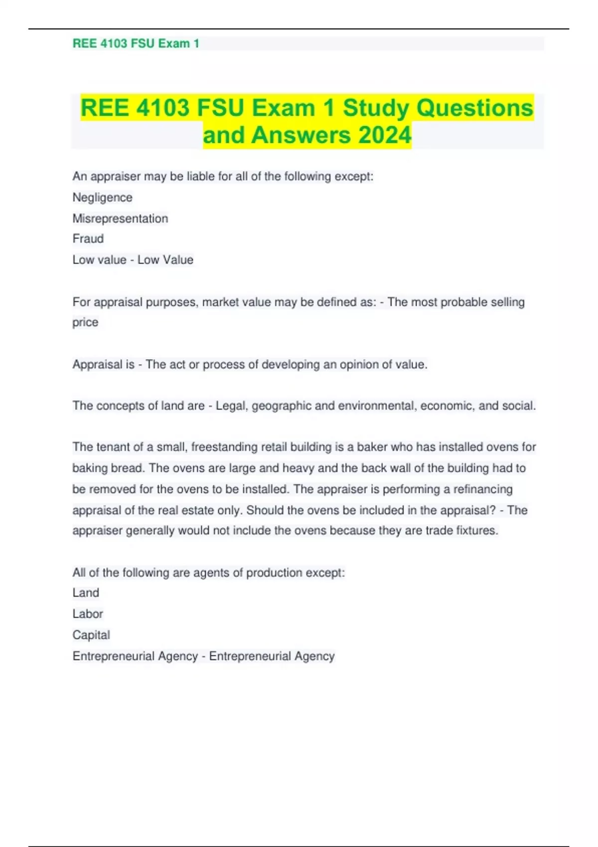 info from transitional neighborhood to get stable An appraiser may be liable for all of the following except: Negligence Misrepresentation Fraud Low value - Low Value For appraisal purposes, market value may be defined as: - The most probable selling price Appraisal is - The act or process of developing an opinion of value. The concepts of land are - Legal, geographic and environmental, economic, and social. The tenant of a small, freestanding retail building is a baker who has installed ovens for baking bread. The ovens are large and heavy and the back wall of the building had to be removed for the ovens to be installed. The appraiser is performing a refinancing appraisal of the real estate only. Should the ovens be included in the appraisal? - The appraiser generally would not include the ovens because they are trade fixtures. All of the following are agents of production except: Land Labor Capital Entrepreneurial Agency - Entrepreneurial Agency The perception that value is created by the expectation of benefits to be derived in the future. - Anticipation The result of the cause and effect relationship among the forces that influence real property value. - Change The amount of a type of real estate available for sale or lease at various prices in a given market at a given time is the: - Supply The amount of a type of real estate desired for purchase or rent at various prices in a given market for a given period of time is the: - Demand Theory that when several similar or commensurate commodities, goods, or services are available, the one with the lowest price attracts the greatest demand and widest distribution.: - Substitution Substitution: - This is the primary principle upon which the cost and sales comparison approaches are based. A buyer will not pay more for one property than for another that is equally desirable. Property values tend to be set by the price of acquiring an equally desirable substitute property. All of the above are correct as applied to the principle of substitution. Factors outside a property that exert both positive and negative influences on the property's value. - Externalities An appraiser gathers market data from a neighborhood where new, high-rise apartment buildings are replacing older, small, multifamily residences. The appraiser uses this data to reflect the value of small, multifamily residences in a stable neighborhood. The appraisal is rejected by a local bank on t