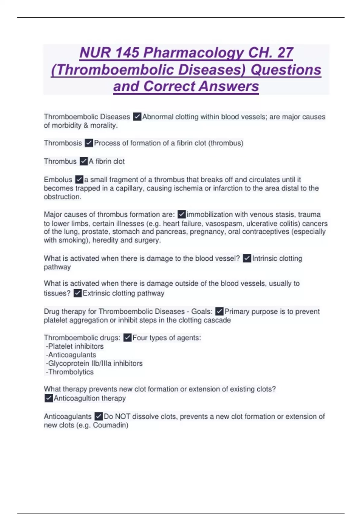 NUR 145 Pharmacology CH. 27 (Thromboembolic Diseases) Questions and Correct Answers