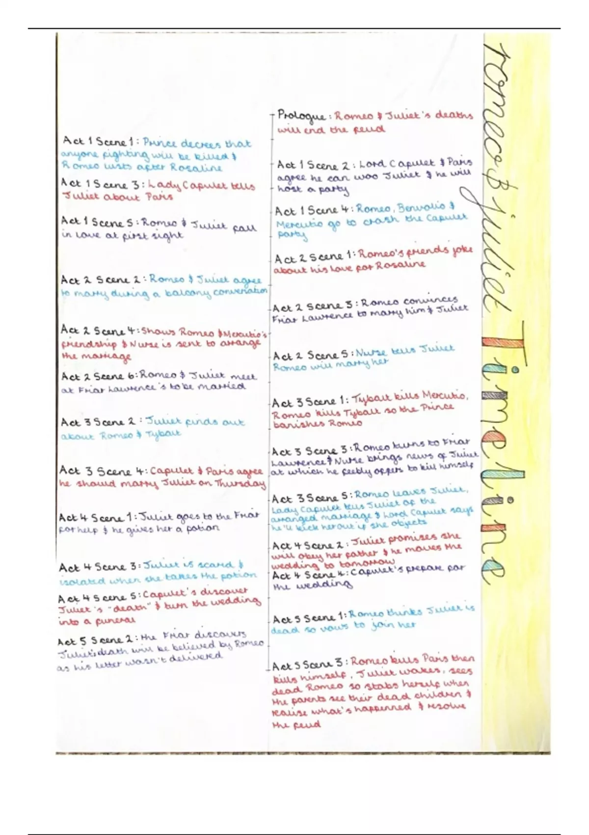 A timeline containing a summary of what happens in every scene. A revision poster containing key quotes with analysis for each from each act. Key quotes (with the act and scene they are from) and their analysis for each of the main characters.