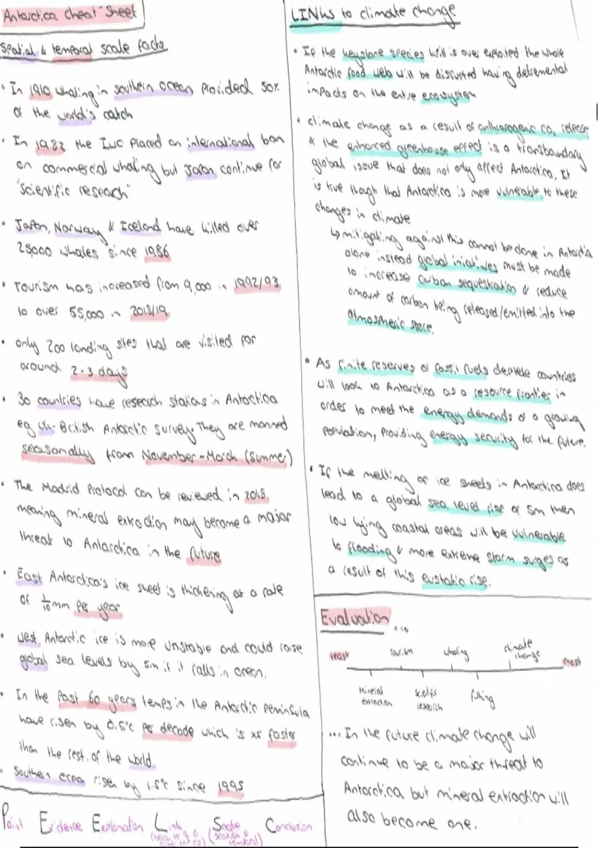 This document outlines the key essay stands needed when writing a 20 mark essay on Antarctica case study which include; evidence, spatial & temporal scale, evaluation, analysis and links to other topics.