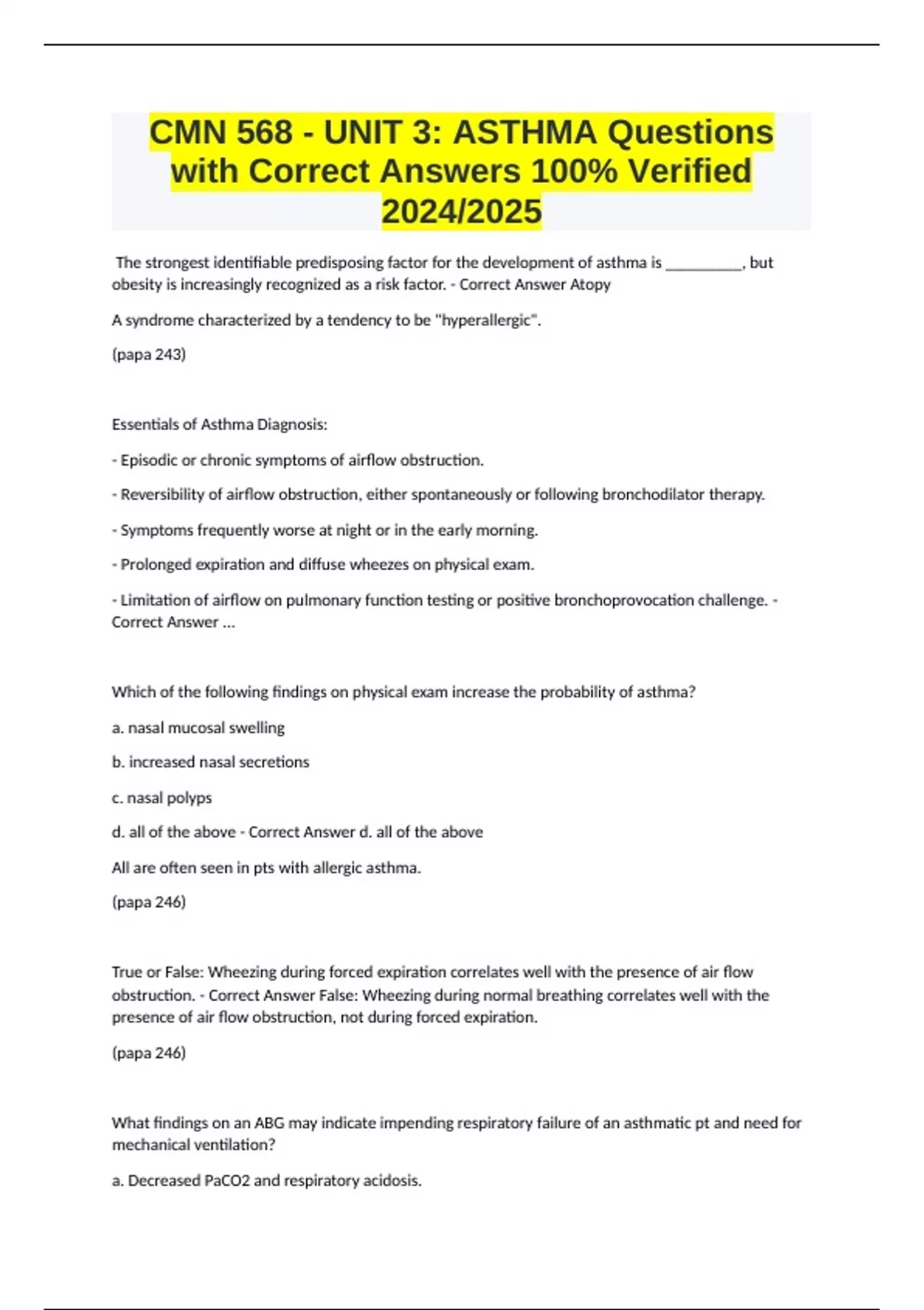 obstruction. - Correct Answer False: Wheezing during normal breathing correlates well with the