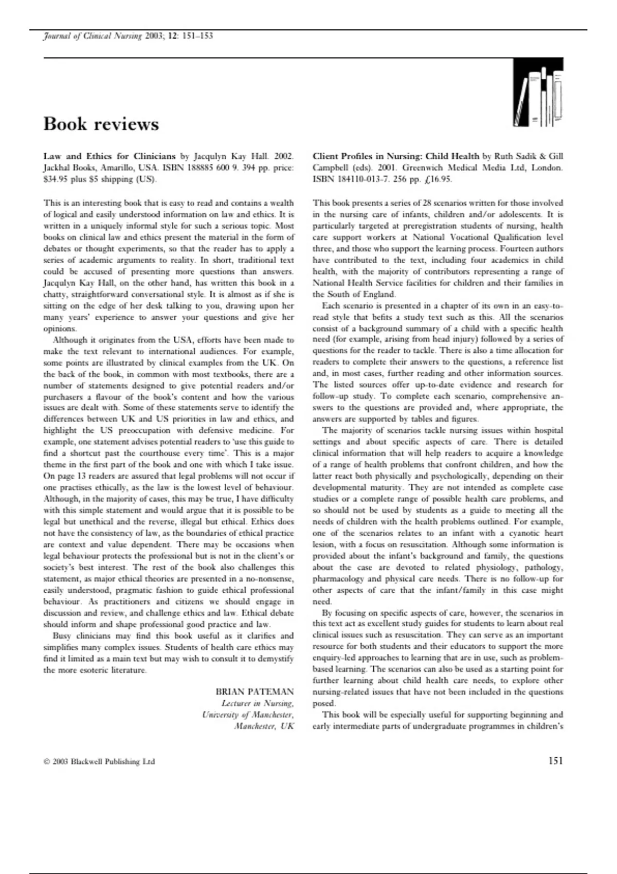 Law and Ethics for Clinicians by Jacqulyn Kay Hall. 2002. Client Profiles in Nursing: Child Health by Ruth Sadik & Gill