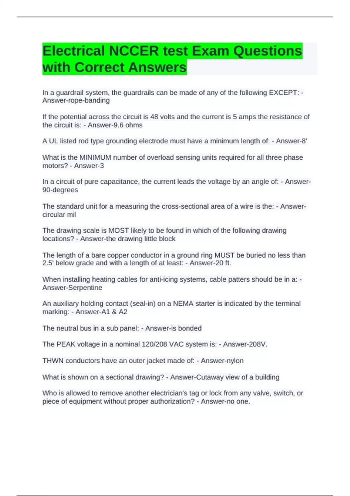 In a guardrail system, the guardrails can be made of any of the following EXCEPT: - Answer-rope-banding If the potential across the circuit is 48 volts and the current is 5 amps the resistance of the circuit is: - Answer-9.6 ohms A UL listed rod type grounding electrode must have a minimum length of: - Answer-8' What is the MINIMUM number of overload sensing units required for all three phase motors? - Answer-3 In a circuit of pure capacitance, the current leads the voltage by an angle of: - Answer-90-degrees The standard unit for a measuring the cross-sectional area of a wire is the: - Answer-circular mil The drawing scale is MOST likely to be found in which of the following drawing locations? - Answer-the drawing little block The length of a bare copper conductor in a ground ring MUST be buried no less than 2.5' below grade and with a length of at least: - Answer-20 ft. When installing heating cables for anti-icing systems, cable patters should be in a: - Answer-Serpentine An auxiliary holding contact (seal-in) on a NEMA starter is indicated by the terminal marking: - Answer-A1 & A2 The neutral bus in a sub panel: - Answer-is bonded The PEAK voltage in a nominal 120/208 VAC system is: - Answer-208V. THWN conductors have an outer jacket made of: - Answer-nylon What is shown on a sectional drawing? - Answer-Cutaway view of a building Who is allowed to remove another electrician's tag or lock from any valve, switch, or piece of equipment without proper authorization? - Answer-no one.