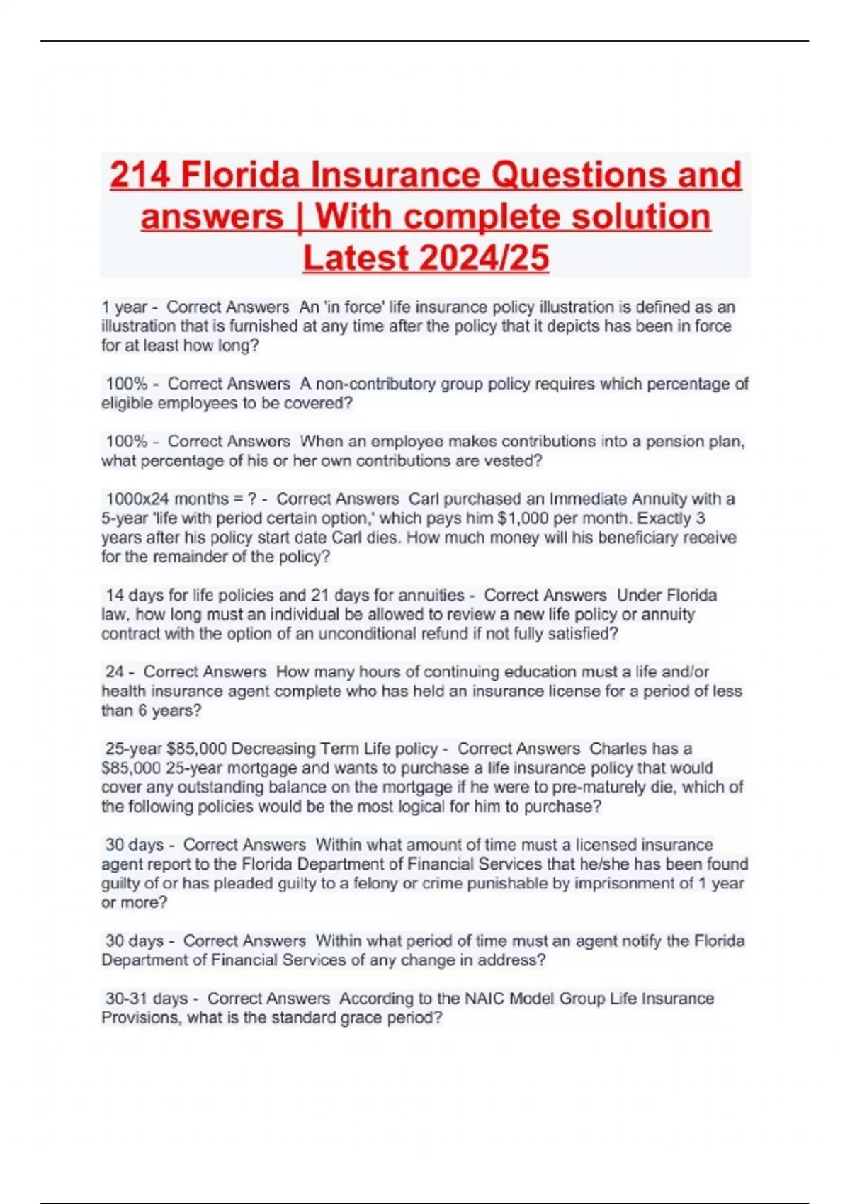 214 Florida Insurance Questions and answers | With complete solution Latest 2024/25
