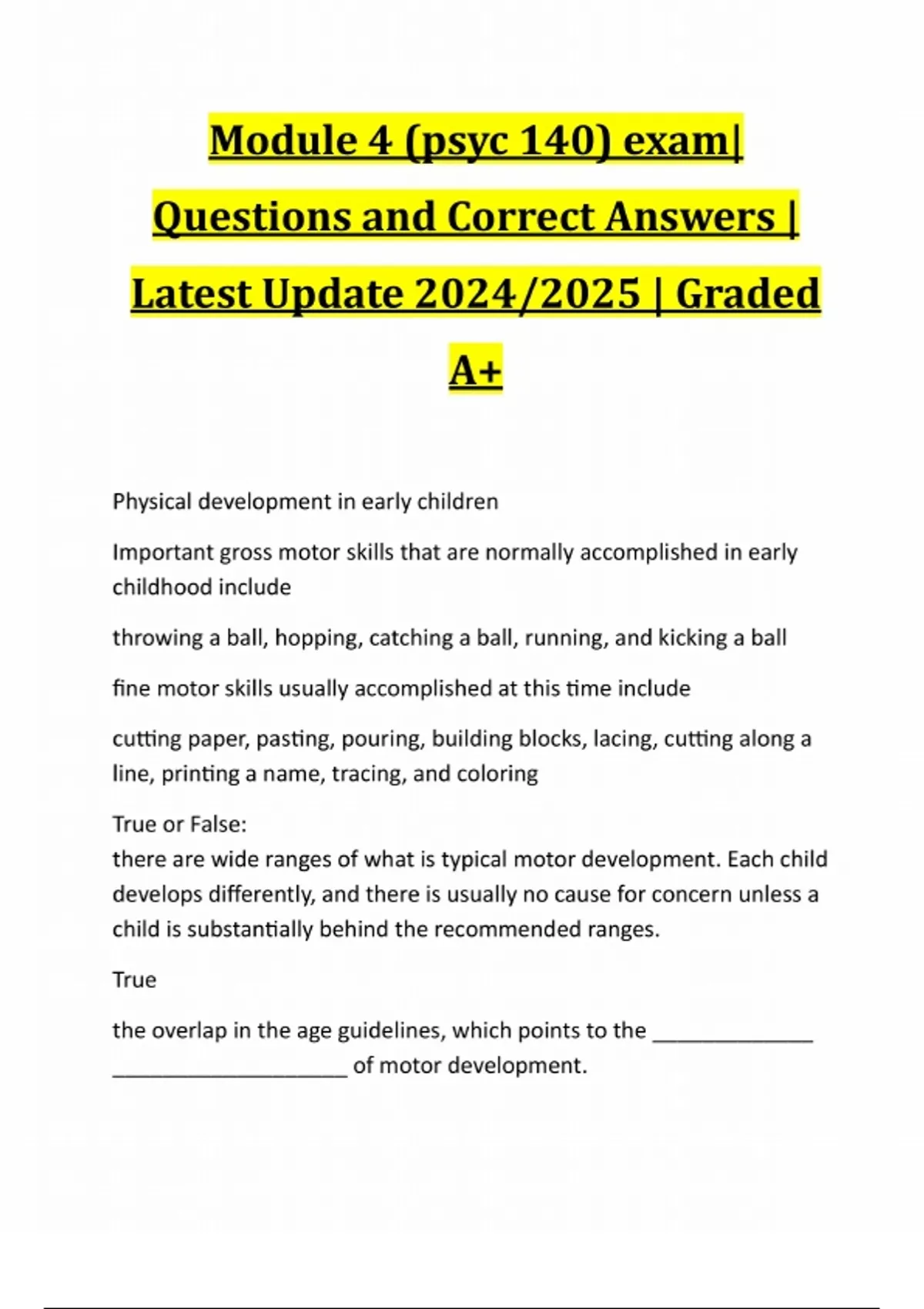 Module 4 (psyc 140) exam| Questions and Correct Answers | Latest Update 2024/2025 | Graded A+ Physical development in early children Important gross motor skills that are normally accomplished in early childhood include throwing a ball, hopping, catching a ball, running, and kicking a ball fine motor skills usually accomplished at this time include cutting paper, pasting, pouring, building blocks, lacing, cutting along a line, printing a name, tracing, and coloring True or False: there are wide ranges of what is typical motor development. Each child develops differently, and there is usually no cause for concern unless a child is substantially behind the recommended ranges. True the overlap in the age guidelines, which points to the _____________ ___________________ of motor nuous nature Age: 2-3 years Gross Motor Fine Motor Can jump. Can throw and catch a ball, although the upper body remains rigid. Can zip and unzip. Can use a spoon. Age: 3-4 years Gross Motor Fine Motor
