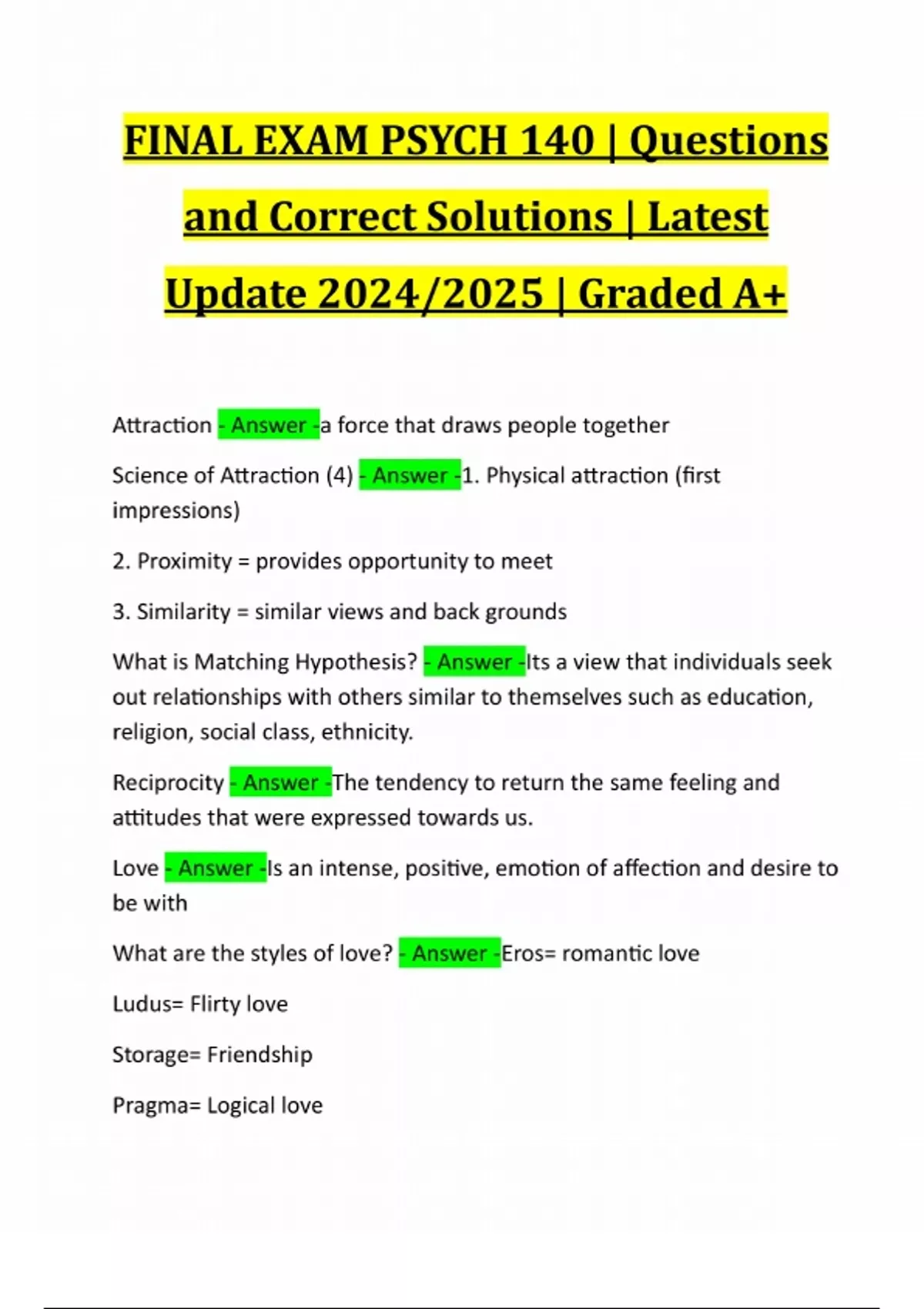 FINAL EXAM PSYCH 140 | Questions and Correct Solutions | Latest Update 2024/2025 | Graded A+ Attraction - Answer -a force that draws people together Science of Attraction (4) - Answer -1. Physical attraction (first impressions) 2. Proximity = provides opportunity to meet 3. Similarity = similar views and back grounds What is Matching Hypothesis? - Answer -Its a view that individuals seek out relationships with others similar to themselves such as education, religion, social class, ethnicity. Reciprocity - Answer -The tendency to return the same feeling and attitudes that were expressed towards us. Love - Answer -Is an intense, positive, emotion of affection and desire to be with What are the styles of love? - Answer -Eros= romantic love Ludus= Flirty love Storage= Friendship Pragma= Logical loveMania = possessive love Apage =Selfless, altrustic love The two factor theory of emotion - Answer -1). Physical arousal and cognitive apprasial 2). Arousal from any source that can enhance one's emotion Passionate Love - Answer -an aroused state of intense positive absorption in another, usually present at the be