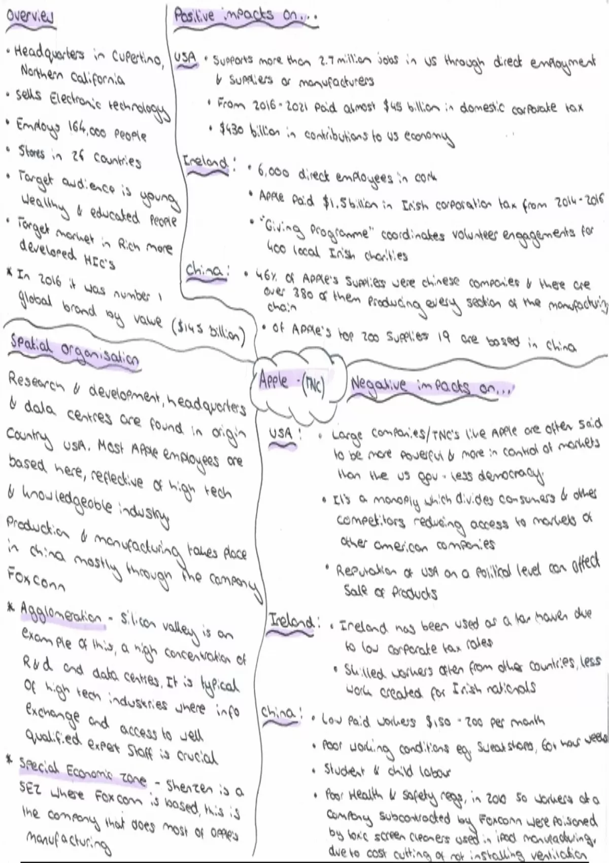 This document compiles information about the TNC Apple. This includes an outline of the company & the spatial distribution of the organisation and its positive and negative impacts on it's home country USA along with host countries China & Ireland. Includes specific case study facts and evidence.