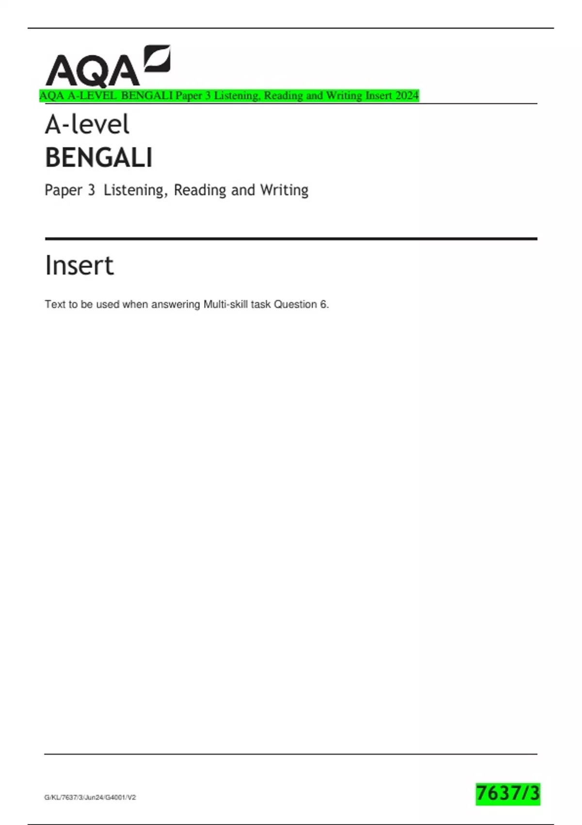 AQA A-LEVEL BENGALI Paper 3 Listening, Reading and Writing Insert 2024