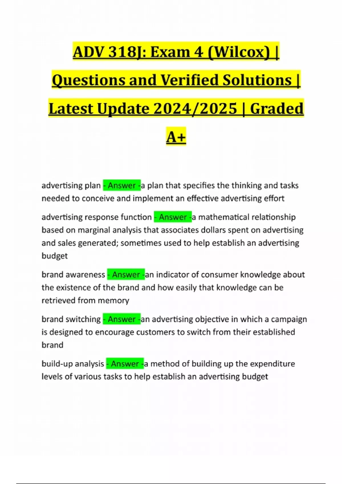 ADV 318J: Exam 4 (Wilcox) | Questions and Verified Solutions | Latest Update 2024/2025 | Graded A+ advertising plan - Answer -a plan that specifies the thinking and tasks needed to conceive and implement an effective advertising effort advertising response function - Answer -a mathematical relationship based on marginal analysis that associates dollars spent on advertising and sales generated; sometimes used to help establish an advertising budget brand awareness - Answer -an indicator of consumer knowledge about the existence of the brand and how easily that knowledge can be retrieved from memory brand switching - Answer -an advertising objective in which a campaign is designed to encourage customers to switch from their established brand build-up analysis - Answer -a method of building up the expenditure levels of various tasks to help establish an advertising budgetcompetitor analysis - Answer -in an advertising plan, the section that discusses who the competitors are, outlining their strengths, weaknesses, tendencies, and any threats they pose ethnocentrism - Answer -the tendency to view and value things from the perspective of one's own culture industry analysis - Answer -in an advertising plan, the section that focuses on developments and trends within an industry and on any other factors that may make a di