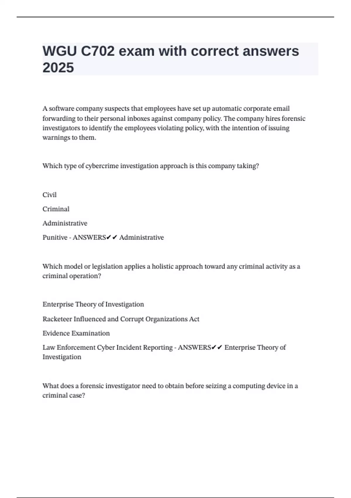 Law |Enforcement |Cyber |Incident |Reporting |- |ANSWERS✔✔ |Enterprise |Theory |of |