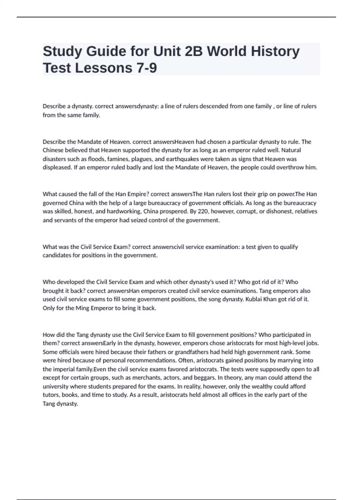 Describe a dynasty. correct answersdynasty: a line of rulers descended from one family , or line of rulers from the same family. Describe the Mandate of Heaven. correct answersHeaven had chosen a particular dynasty to rule. The Chinese believed that Heaven supported the dynasty for as long as an emperor ruled well. Natural disasters such as floods, famines, plagues, and earthquakes were taken as signs that Heaven was displeased. If an emperor ruled badly and lost the Mandate of Heaven, the people could overthrow him. What caused the fall of the Han Empire? correct answersThe Han rulers lost their grip on power.The Han governed China with the help of a large bureaucracy of government officials. As long as the bureaucracy was skilled, honest, and hardworking, China prospered. By 220, however, corrupt, or dishonest, relatives and servants of the emperor had seized control of the government. What was the Civil Service Exam? correct answerscivil service examination: a test given to qualify candidates for positions in the government. Who developed the Civil Service Exam and which other dynasty's used it? Who got rid of it? Who brought it back? correct answersHan emperors created civil service examinations. Tang emperors also used civil service exams to fill some government positions, the song dynasty. Kublai Khan got rid of it. Only for the Ming Emperor to bring it back. How did the Tang dynasty use the Civil Service Exam to fill government positions? Who participated in them? correct answersEarly in the dynasty, however, emperors chose aristocrats for most high-level jobs. Some officials were hired because their fathers or grandfathers had held high government rank. Some were hired because of personal recommendations. Often, aristocrats gained positions by marrying into the imperial family.Even the civil service exams favored aristocrats. The tests were supposedly open to all except for certain groups, such as merchants, actors, and beggars. In theory, any man could attend the university where students prepared for the exams. In reality, however, only the wealthy could afford tutors, books, and time to study. As a result, aristocrats held almost all offices in the early part of the Tang dynasty.