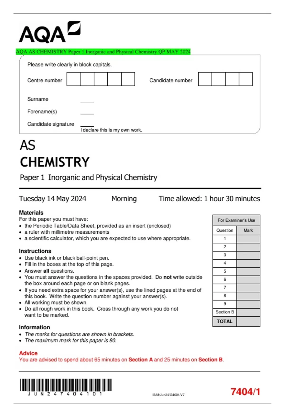 AQA AS CHEMISTRY Paper 1 Inorganic and Physical Chemistry QP MAY 2024