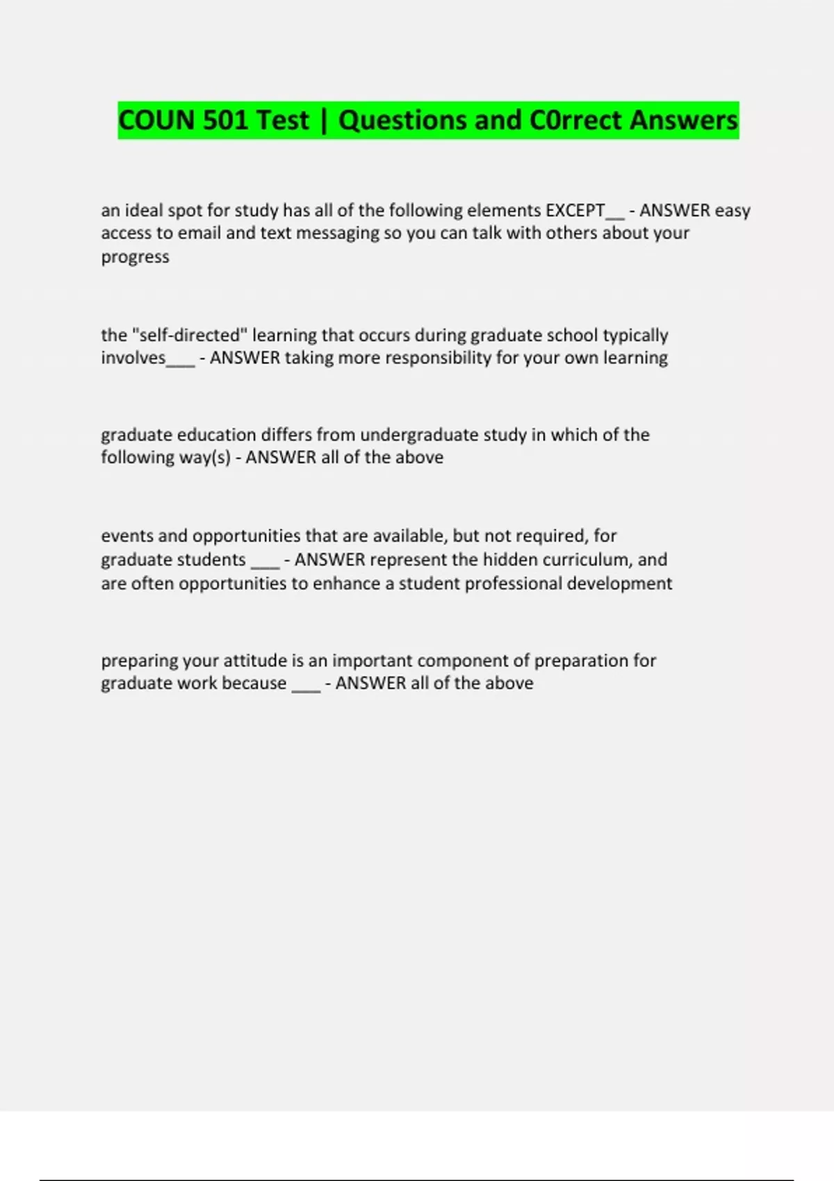 COUN 501 Test | Questions and C0rrect Answers