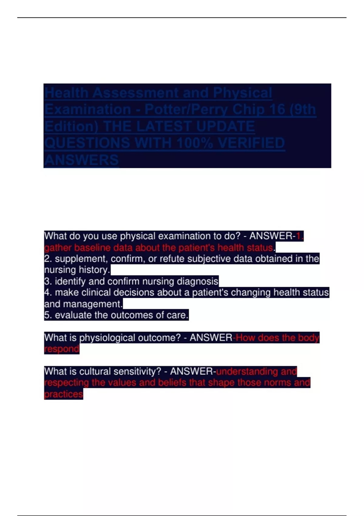 Health Assessment and Physical Examination - Potter/Perry Chip 16 (9th Edition) THE LATEST UPDATE QUESTIONS WITH 100% VERIFIED ANSWERS What do you use physical examination to do? - ANSWER-1. gather baseline data about the patient's health status. 2. supplement, confirm, or refute subjective data obtained in the nursing history. 3. identify and confirm nursing diagnosis 4. make clinical decisions about a patient's changing health status and management. 5. evaluate the outcomes of care. What is physiological outcome? - ANSWER-How does the body respond What is cultural sensitivity? - ANSWER-understanding and respecting the values and beliefs that shape those norms and practices when dealing with cultural sensitivity, what do you consider about the patient's health beliefs? - ANSWER-- use of alternative therapies - nutrition habits - relationships with family - comfort and physical closeness during the exam and history What are 4 skills of the physical assessment? - ANSWER-1) inspection 2) palpation 3) auscultation =stethoscope 4) olfaction = smells during the examination what do you observe for in the patient's emotional responses? - ANSWER-his or her facial expressions show fear or concern or if body movements indicate anxiety What should you do during inspection (5) of a patient? - ANSWER-1) adequate lighting 2) position so you can view all surfaces 3) inspect each area for size, shape, color, symmetry, position, abnormalities 4) compare with same are on opposite side 5) do not hurry what are some tips for keeping an examination well organized? - ANSWER-1. compare both sides of the body for symmetry 2. if the patient is seriously ill, first assess the systems of the body most at risk for being abnormal. 3. if the patient becomes fatigued, offer rest periods between assessments. 4. perform painful procedures near the end of an examination. 5. record assessments in specific terms in the electronic or paper record. 6. use common and accepted medical terms and abbreviations to keep notes accurate, brief, and concise. 7. record quick notes during the examination to avoid delays. complete larger documents at the end of the examination. what is palpation? - ANSWER-an examination technique in which the examiner's hands are used to feel the texture, size, consistency, and location of certain body parts what do you palpate the skin for? - ANSWER-temp moisture texture turgor tenderness thickness abdomen for tenderness distention masses. what do you use the palmar surface of your hand for? - ANSWER-used to determine position, texture, size,consistency, masses, fluid, and crepitus what do you use the dorsal surface of your hand for? - ANSWERtemperature Olfaction? - ANSWER-- helps to detect abnormalities that cannot be recognized by any other means - can lead to detection of serious abnormalities Preparation for assessment? - ANSWER-- preparing patient - preparing environment - position patient - equipment organized What to keep in mind during an assessment for older adults? - ANSWER-1) do not assume they are sick or disabled 2) allow extra time; don't rush 3) plan your exam to prevent too much movement 4) provide space What is a general survey? - ANSWER-1) assess appearance and behavior 2) assess vital signs 3) assess height and weight (most important for med order purpose) Assessment of the skin includes? - ANSWER-1) color 2) temp 3) moisture 4) texture 5) turgor 6) vascularity 7) edema 8) lesions What is edema? - ANSWER-swelling What is vascularity? - ANSWER-Degree to which the veins in a body part are visible What is turgor? - ANSWER-Elasticity of the skin Assessment of hair and scalp includes? - ANSWER-1) color 2) distribution 3) quantity 4) thickness 5) texture 6) lubrication 7) clean Assessment of nails condition reflects? - ANSWER-- general health - state of nutrition - occupation - level of self-care - age Assessment of the head and neck uses? - ANSWER-1) inspection 2) palpation 3) auscultation assessment of head and neck? - ANSWER-1) position, size, shape, and contour 2) symmetry 3) size, shape, and contour of the skull 4) neck movement What does PERRLA stand for? - ANSWER-Pupils Equal, Round, Reactive to Light Accommodation Assessment of mouth and pharynx includes? - ANSWER-1) color 2) texture 3) hydration (lips) 4) contour 5) lesions 6) teeth 7) gums 8) tongue Assessment of thorax and lungs includes? - ANSWER-Visualize the lobes of the lungs Sounds to label for lung noise? - ANSWER-- adventitious = anything but normal - normal - decreased - absent Assessment of heart includes? - ANSWER-1) find heart and put stethoscope 2) determine the rate 3) is it regular or irregular What is adventitious sounds? - ANSWER-abnormal breath sounds What is arcus senilis? - ANSWER-thin white ring along the margin of the iris What is atrophy? - ANSWER-Inflammation or adhesions What is auscultation? - ANSWER-listening to sounds within the body What is a bruit? - ANSWER-blowing, swooshing sound heard through a stethoscope when an artery is partially occluded What is cerumen? - ANSWER-ear wax What is the costovertebral angle? - ANSWER-formed by the last rib and vertebral column is a landmark used during palpation of the kidney What is crackles (rales)? - ANSWER-fine crackling or bubbling sounds, commonly heard during inspiration when there is fluid in the alveoli What is cyanosis? - ANSWER-bluish discoloration of the skin What is the dorsum? - ANSWER-back of hand What is dyspnea? - ANSWER-difficult or labored breathing (breathlessness) What is dysrhythmia? - ANSWER-failure of the heart to beat at regular successive intervals What is erythema? - ANSWER-redness of the skin What is indurated? - ANSWER-pertaining to an area of hardened tissue What is inspection? - ANSWER-Use of vision to distinguish normal from abnormal findings What is the integument? - ANSWER-Consists of skin, hair, scalp, and nails What is the intercostal spaces? - ANSWER-spaces between the ribs What is jaundice? - ANSWER-yellow-orange discoloratio