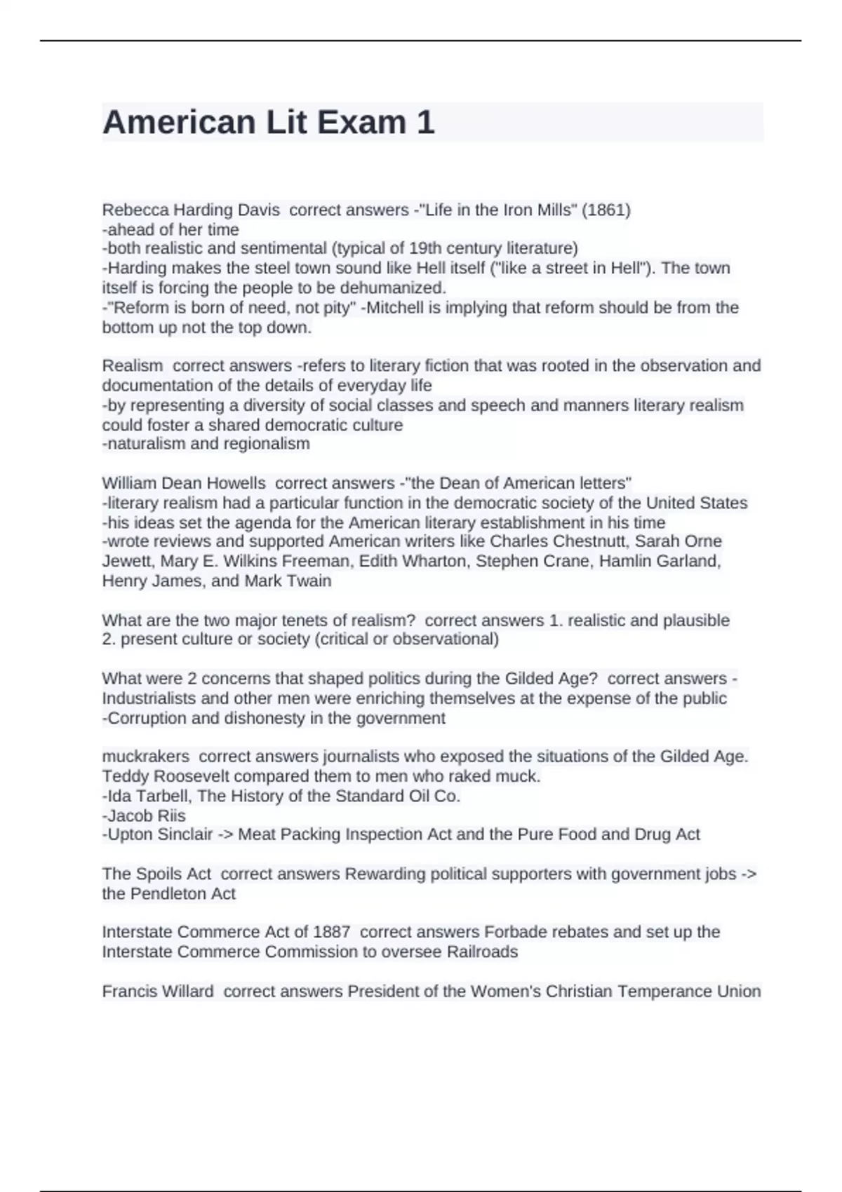Realism correct answers -refers to literary fiction that was rooted in the observation and