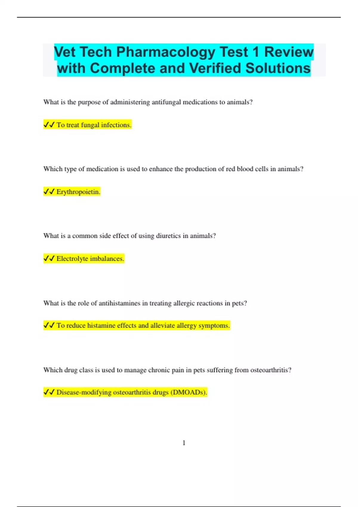 Vet Tech Pharmacology Test 1 Review with Complete and Verified Solutions What is the purpose of administering antifungal medications to animals? To treat fungal infections. Which type of medication is used to enhance the production of red blood cells in animals? Erythropoietin. What is a common side effect of using diuretics in animals? Electrolyte imbalances. What is the role of antihistamines in treating allergic reactions in pets? To reduce histamine effects and alleviate allergy symptoms. Which drug class is used to manage chronic pain in pets suffering from osteoarthritis? Disease-modifying osteoarthritis drugs (DMOADs). 2 What is the purpose of administering antacids to animals? To neutralize stomach acid and alleviate symptoms of acid reflux. Name a common use of sedatives in veterinary care. To calm animals before a procedure. What is the role of muscle relaxants in treating conditions like tetanus? To relieve muscle spasms and rigidity. Which medication is used to treat hyperthyroidism in cats? Methimazole. What should be monitored when administering anticoagulants to animals? Blood clotting times to prevent excessive bleeding. What is the main function of analgesics in veterinary medicine? To relieve pain.