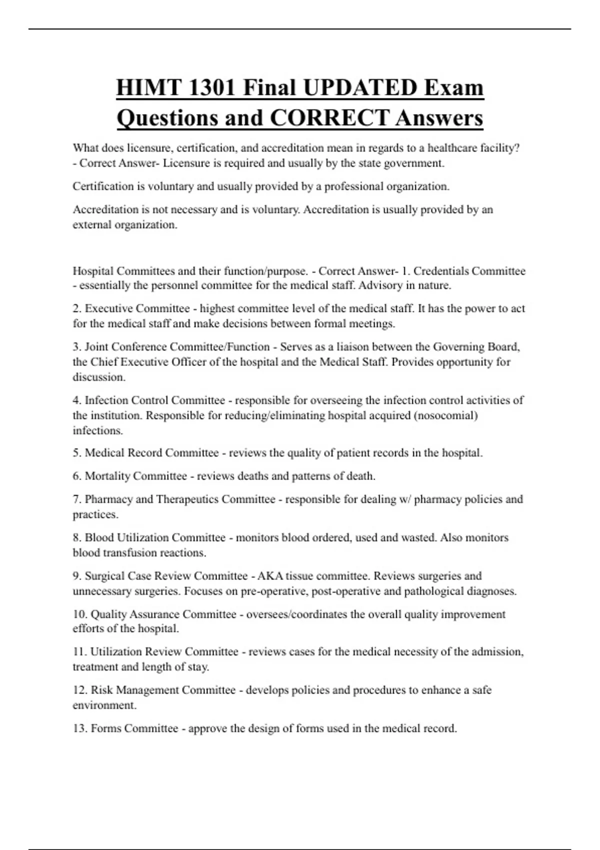 Hospital Committees and their function/purpose. - Correct Answer- 1. Credentials Committee