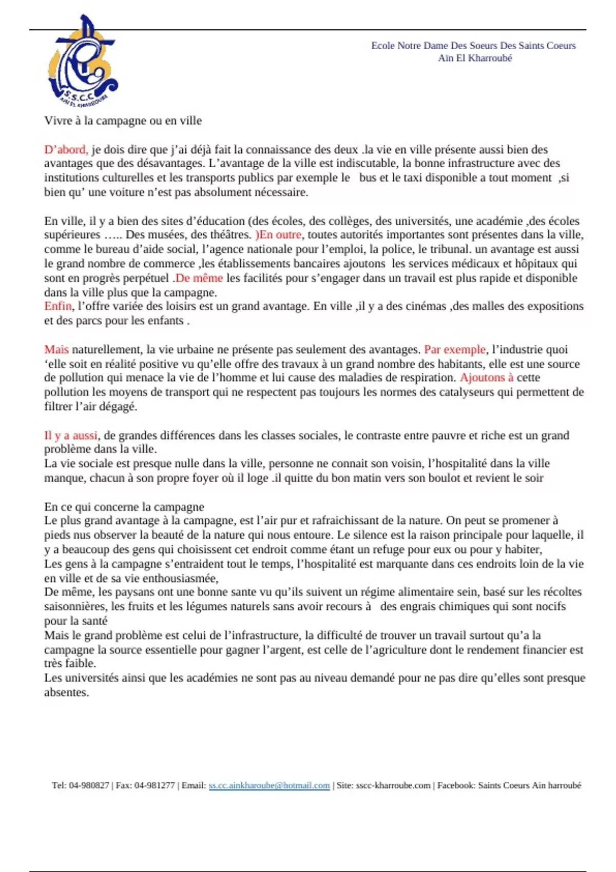 Tel: 04-980827 | Fax: 04-981277 | Email: | Site: sscc-kharroube.com | Facebook: Saints Coeurs Ain harroubé