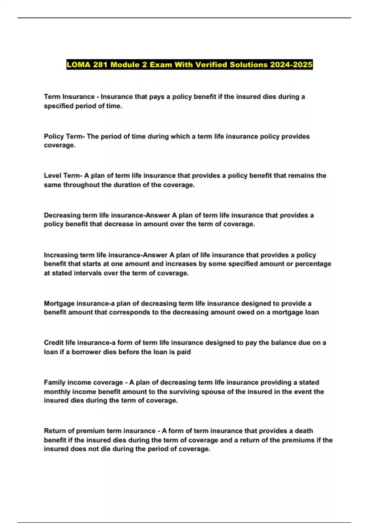 Level Term- A plan of term life insurance that provides a policy benefit that remains the