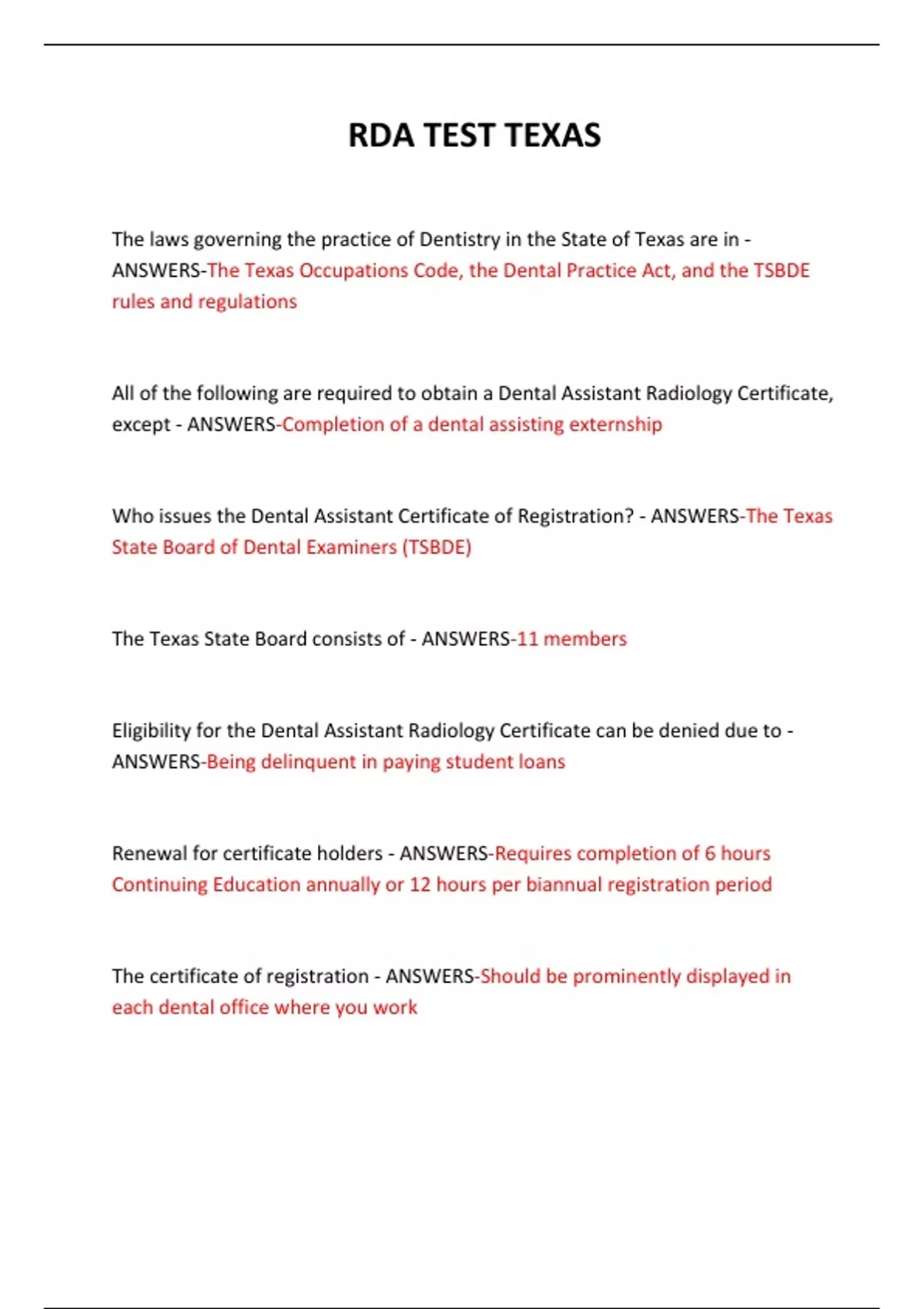 ANSWERS-The Texas Occupations Code, the Dental Practice Act, and the TSBDE