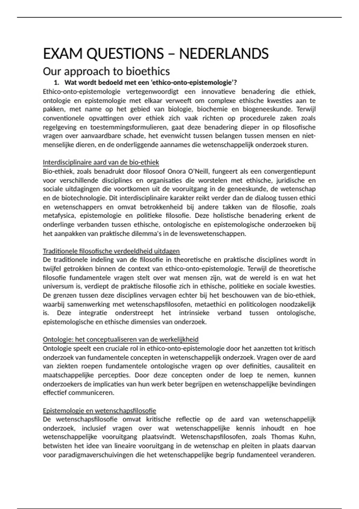 Dit document omvat de examenvragen van het vak 'bio-ethics' (Nederlands).