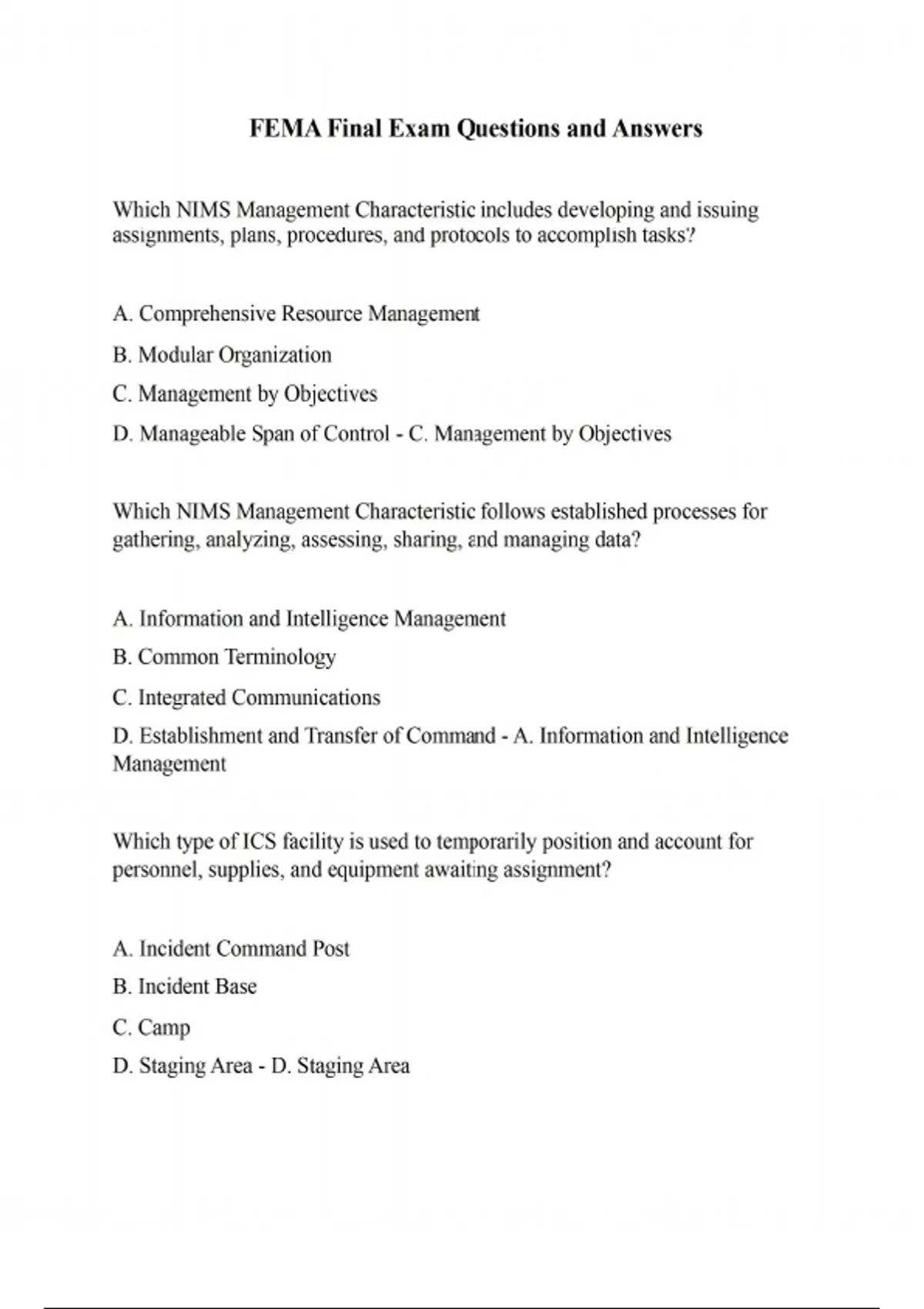 Which NIMS Management Characteristic includes developing and issuing assignments, plans, procedures, and protocols to accomplish tasks? A. Comprehensive Resource Management B. Modular Organization C. Management by Objectives D. Manageable Span of Control - C. Management by Objectives Which NIMS Management Characteristic follows established processes for gathering, analyzing, assessing, sharing, and managing data? A. Information and Intelligence Management B. Common Terminology C. Integrated Communications D. Establishment and Transfer of Command - A. Information and Intelligence Management Which type of ICS facility is used to temporarily position and account for personnel, supplies, and equipment awaiting assignment? A. Incident Command Post B. Incident Base C. Camp D. Staging Area - D. Staging Area
