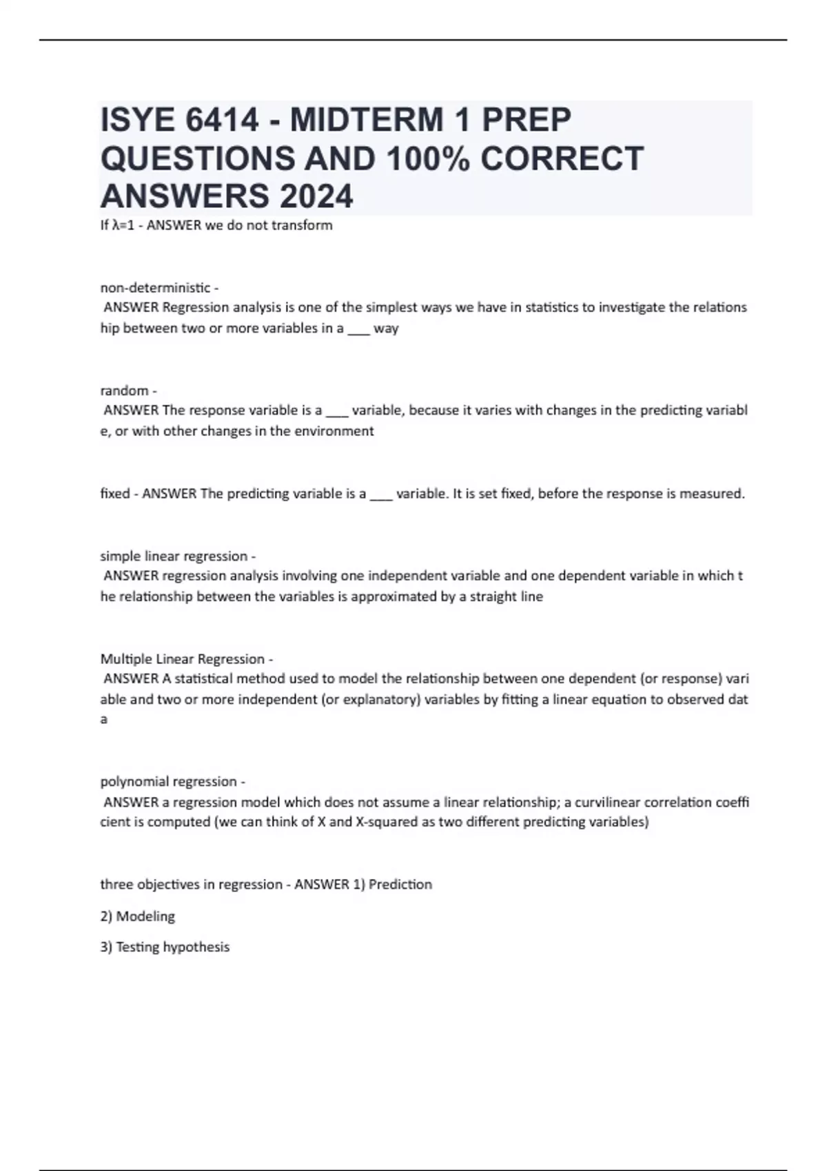 ISYE 6414 PACKAGE DEAL QUESTIONS AND 100% CORRECT ANSWERS WITH VERIFIED SOLUTIONS UPDATED 2024