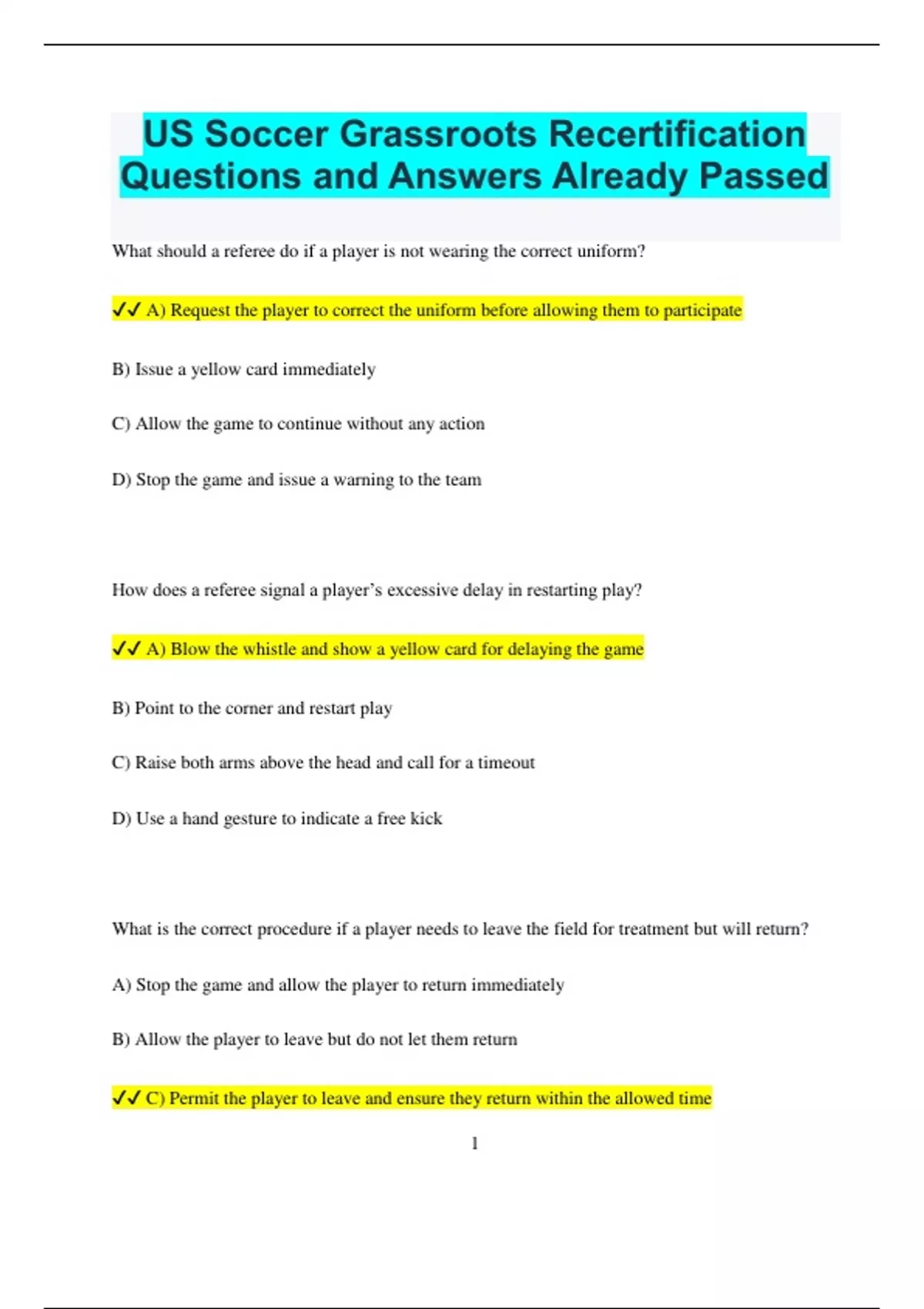 US Soccer Grassroots Recertification Questions and Answers Already Passed What should a referee do if a player is not wearing the correct uniform? A) Request the player to correct the uniform before allowing them to participate B) Issue a yellow card immediately C) Allow the game to continue without any action D) Stop the game and issue a warning to the team How does a referee signal a player’s excessive delay in restarting play? A) Blow the whistle and show a yellow card for delaying the game B) Point to the corner and restart play C) Raise both arms above the head and call for a timeout D) Use a hand gesture to indicate a free kick What is the correct procedure if a player needs to leave the field for treatment but will return? A) Stop the game and allow the player to return immediately B) Allow the player to leave but do not let them return C) Permit the player to leave and ensure they return within the allowed time 2 D) Issue a red card and replace the player How should a referee handle a situation where players repeatedly enter the field of play without permission? A) Ignore the behavior and continue the match B) Stop the game and issue warnings or cards as necessary C) Award a penalty kick to the opposing team D) Call a timeout and review the rules with the players What signal should a referee use if a player is involved in a dangerous play but it is not a serious foul? A) Blow the whistle and award an indirect free kick B) Issue a red card and stop the game C) Point to the corner for a corner kick D) Allow play to continue without interruption What action should a referee take if they accidentally stop play for an offside call that was incorrect? A) Restart play with a drop ball
