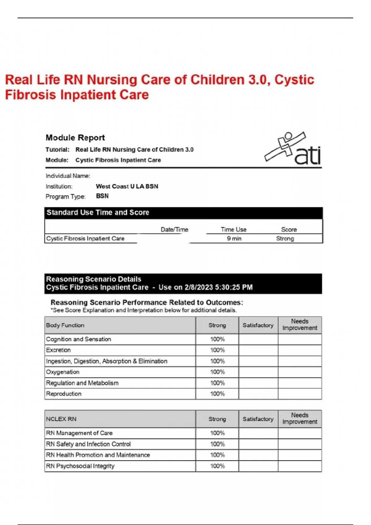 Real Life RN Nursing Care of Children 3.0, Cystic Fibrosis Inpatient Care The document from Pediatrics provides a detailed report on the performance of Dayan Mathew, a nursing student at West Coast University in Los Angeles, in a BSN program. The report includes information on the standard use time and score for Cystic Fibrosis Inpatient Care, showing a strong performance. The module report focuses on the Real Life RN Nursing Care of Children, specifically in the context of Cystic Fibrosis Inpatient Care. The reasoning scenario details highlight the performance related to outcomes in various body functions, with strong and satisfactory results overall. The report also assesses the performance in NCLEX RN categories, showing strong results in areas such as Management of Care, Safety and Infection Control, Health Promotion, Psychosocial Integrity, and Pharmacological and Parenteral care. Overall, the document reflects Dayan Mathew's proficiency in nursing care, particularly in the context of Cystic Fibrosis Inpatient Care.