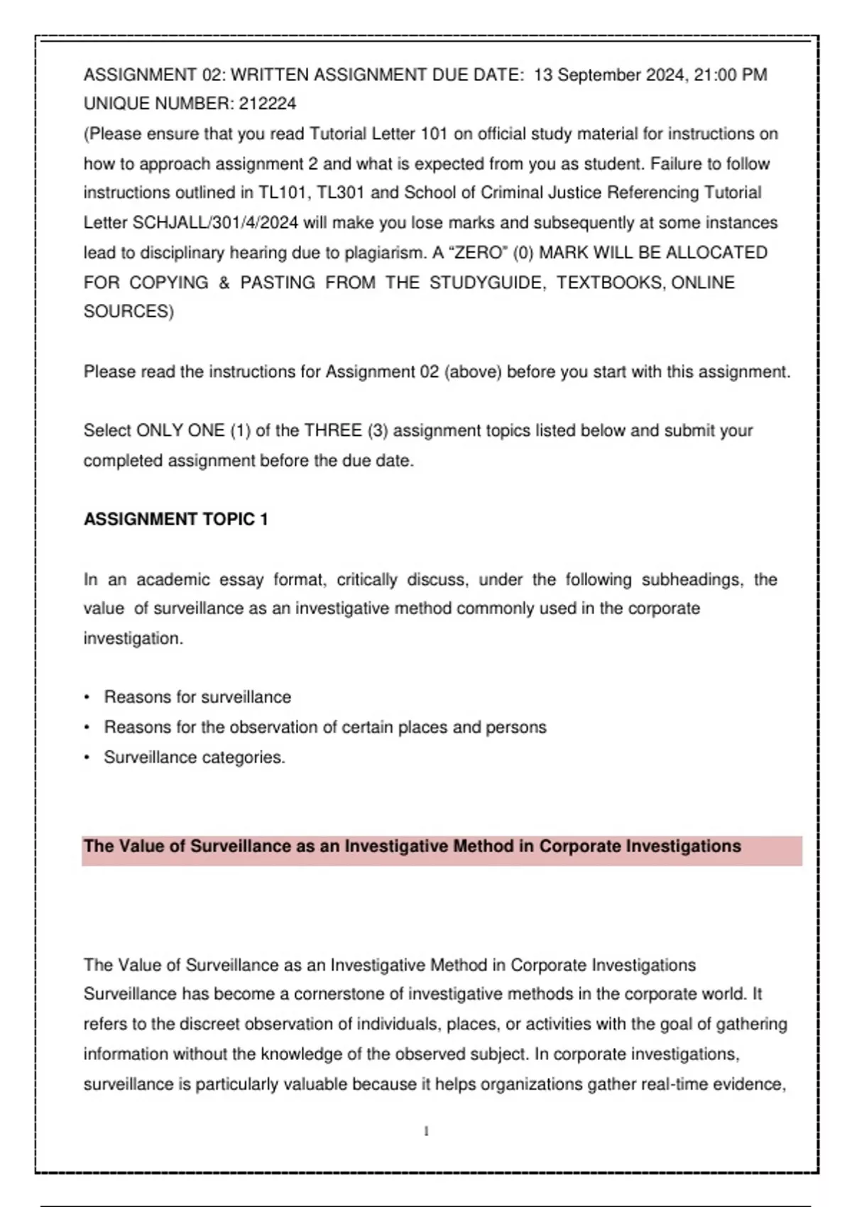 SEP3703 Assignment 2 2024 ASSIGNMENT TOPIC 1 In an academic essay format, critically discuss, under the following subheadings, the value of surveillance as an investigative method commonly used in the corporate investigation. • Reasons for surveillance • Reasons for the observation of certain places and persons • Surveillance categories. The Value of Surveillance as an Investigative Method in Corporate Investigations The Value of Surveillance as an Investigative Method in Corporate Investigations Surveillance has become a cornerstone of investigative methods in the corporate world. It refers to the discreet observation of individuals, places, or activities with the goal of gathering information without the knowledge of the observed subject. In corporate investigations, surveillance is particularly valuable because it helps organizations gather real-time evidence,