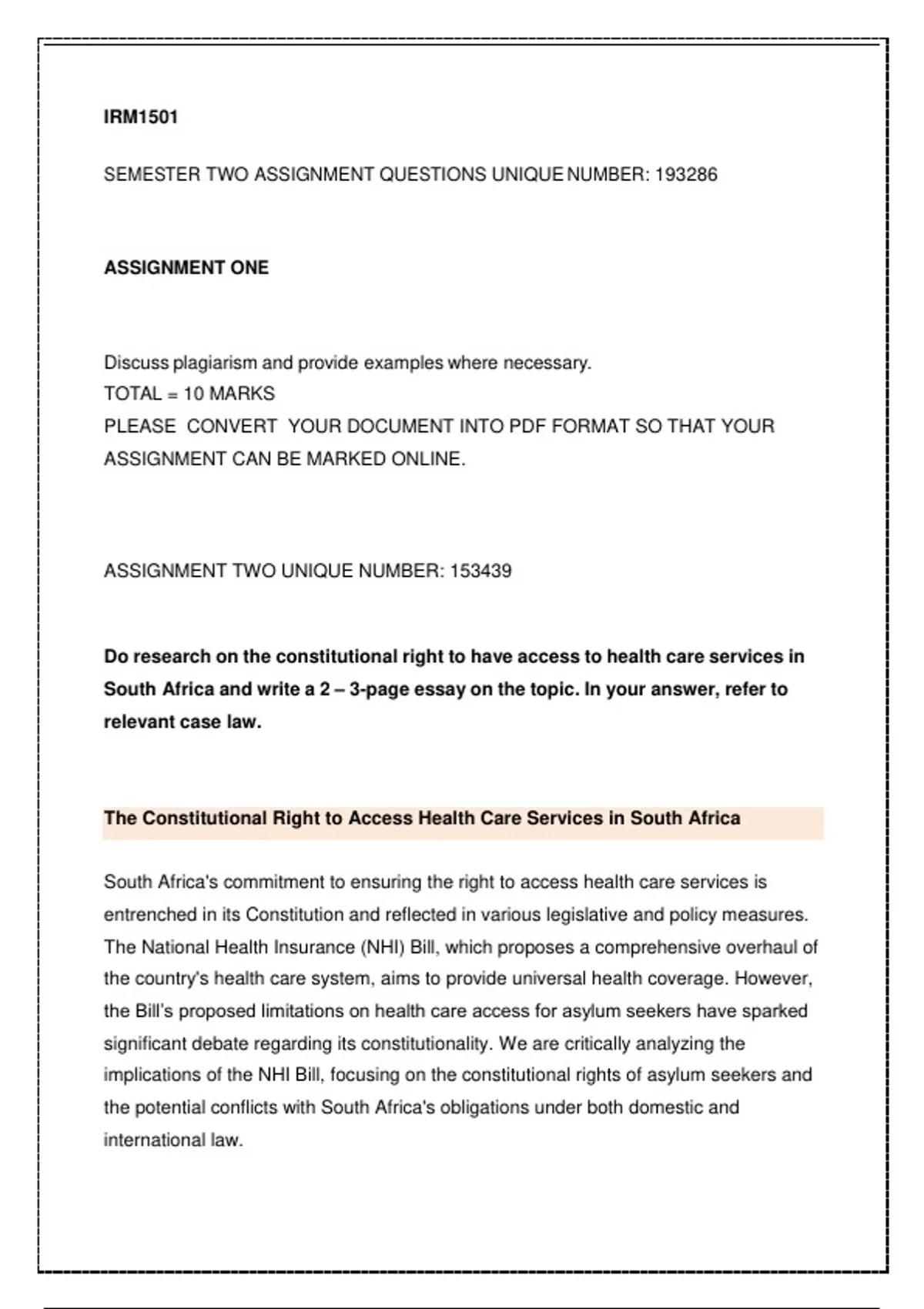 SEMESTER TWO ASSIGNMENT QUESTIONS UNIQUE NUMBER: 193286