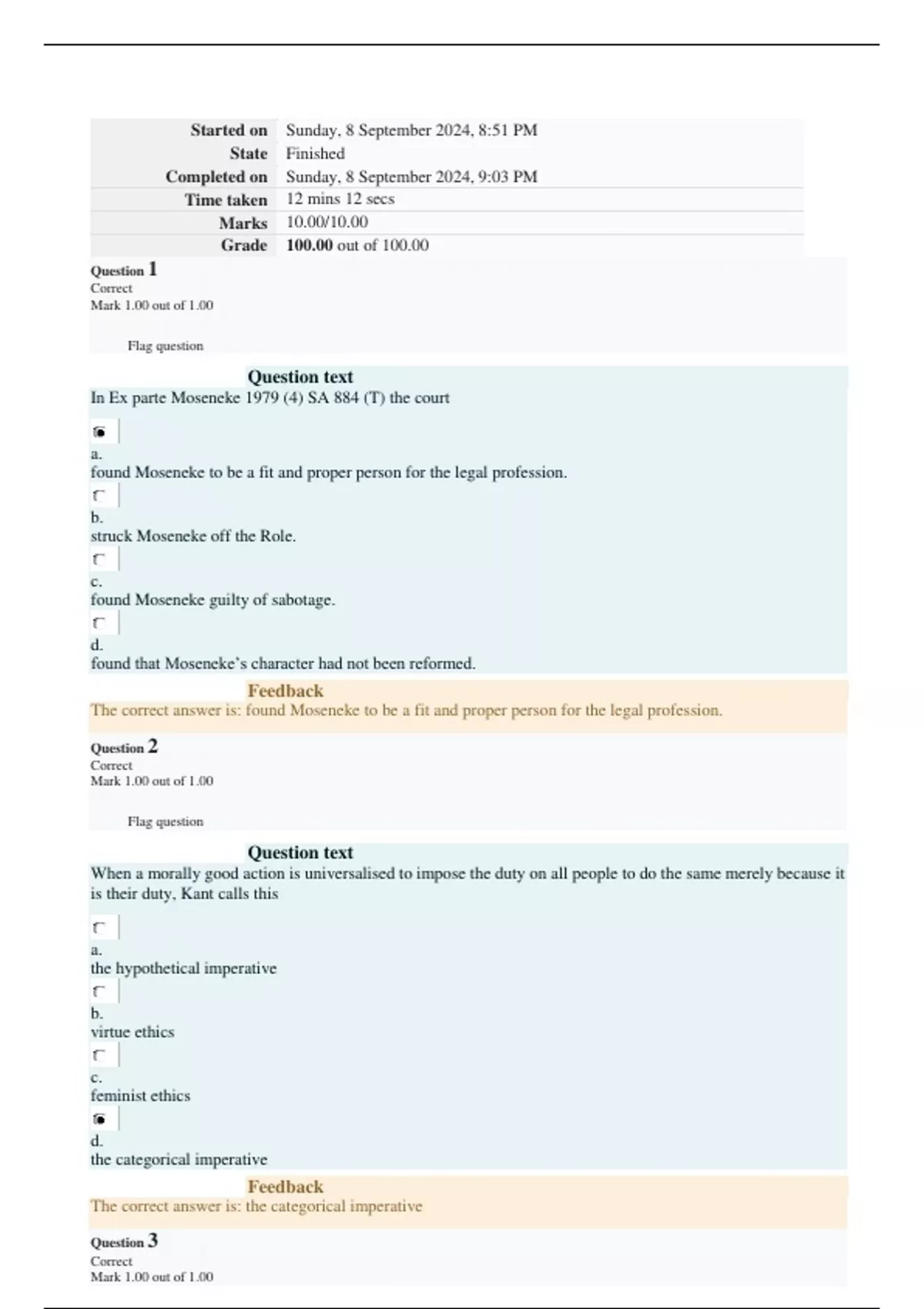 LJU4802 ASSIGNMENT 2 2024 Started on Sunday, 8 September 2024, 8:51 PM State Finished Completed on Sunday, 8 September 2024, 9:03 PM Time taken 12 mins 12 secs Marks 10.00/10.00 Grade 100.00 out of 100.00 Question 1 Correct Mark 1.00 out of 1.00 Flag question Question text In Ex parte Moseneke 1979 (4) SA 884 (T) the court a.