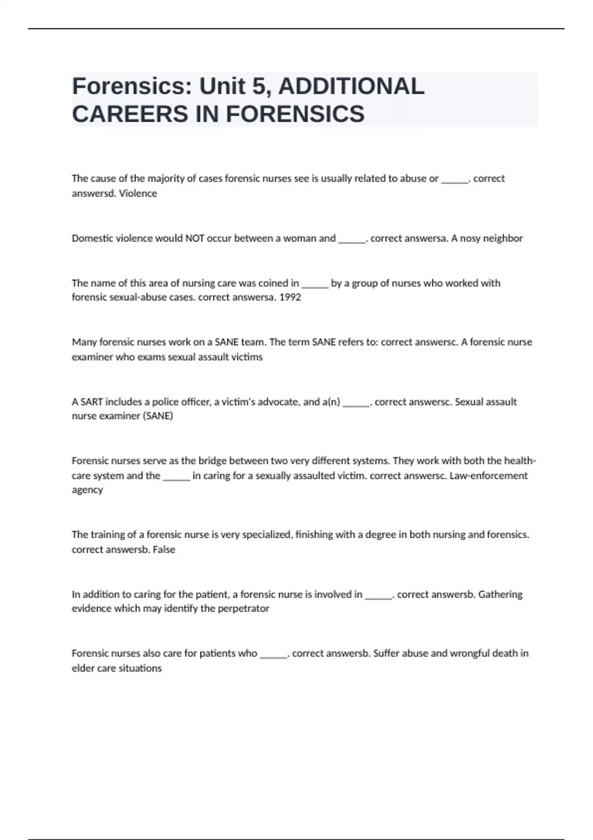 Many forensic nurses work on a SANE team. The term SANE refers to: correct answersc. A forensic nurse