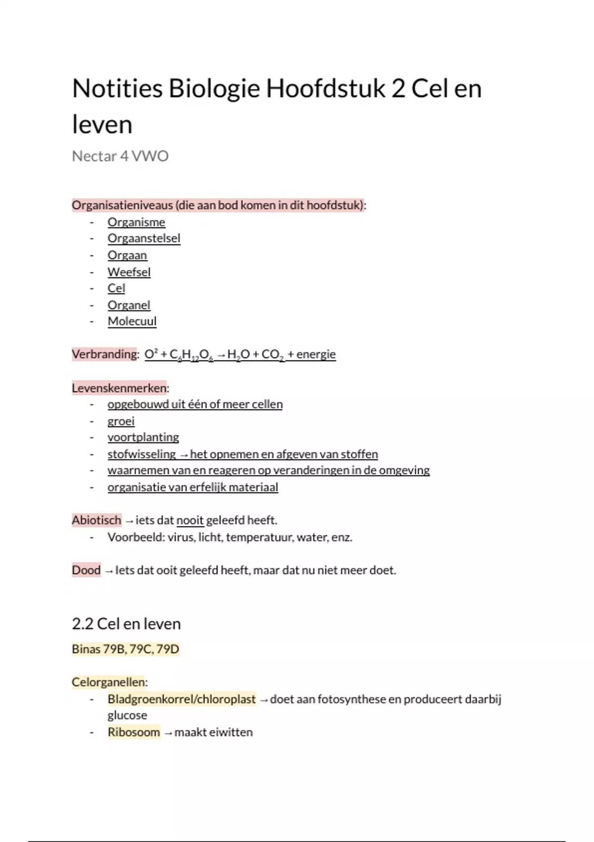 Les aantekeningen Biologie Nectar 4 vwo Flex-boek Hoofdstuk 2 Cel en leven