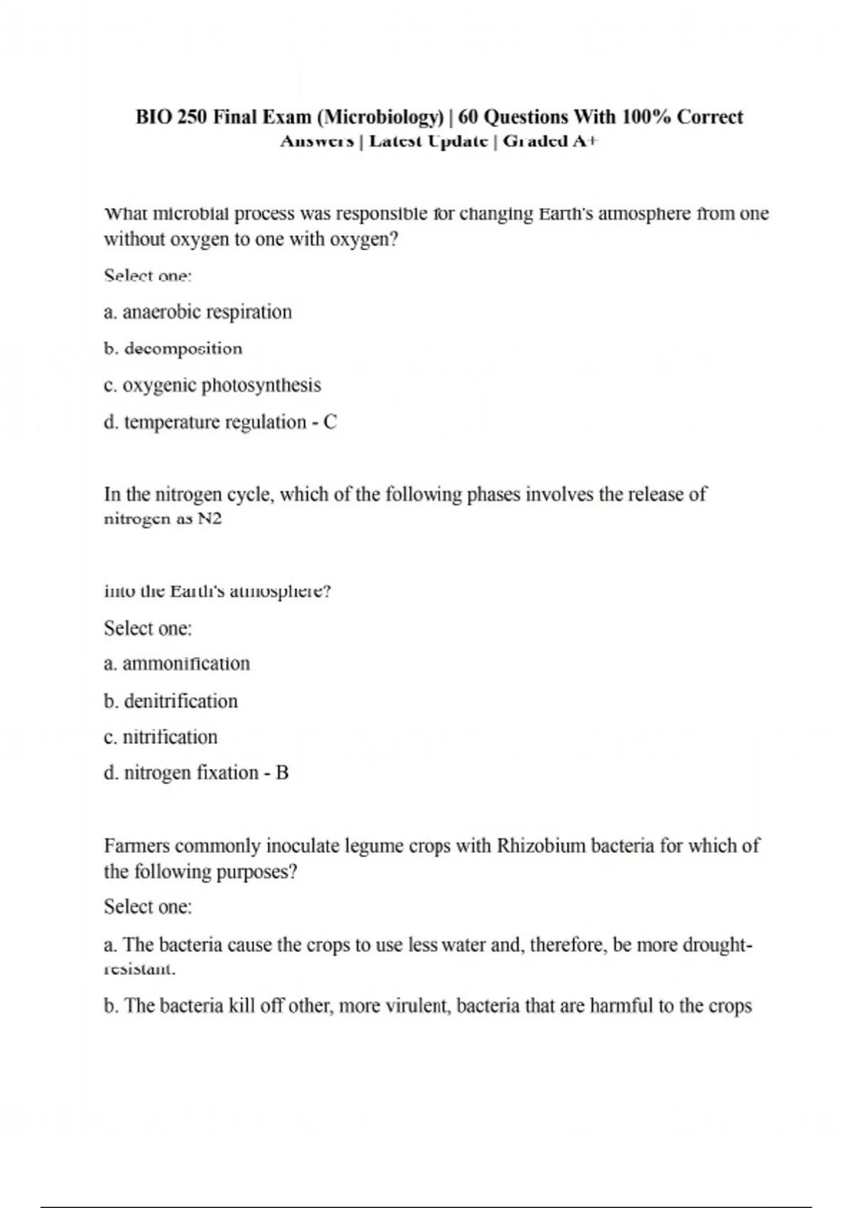 BIO 250 Final Exam (Microbiology) | 60 Questions With 100% Correct Answers | Latest Update | Graded A+