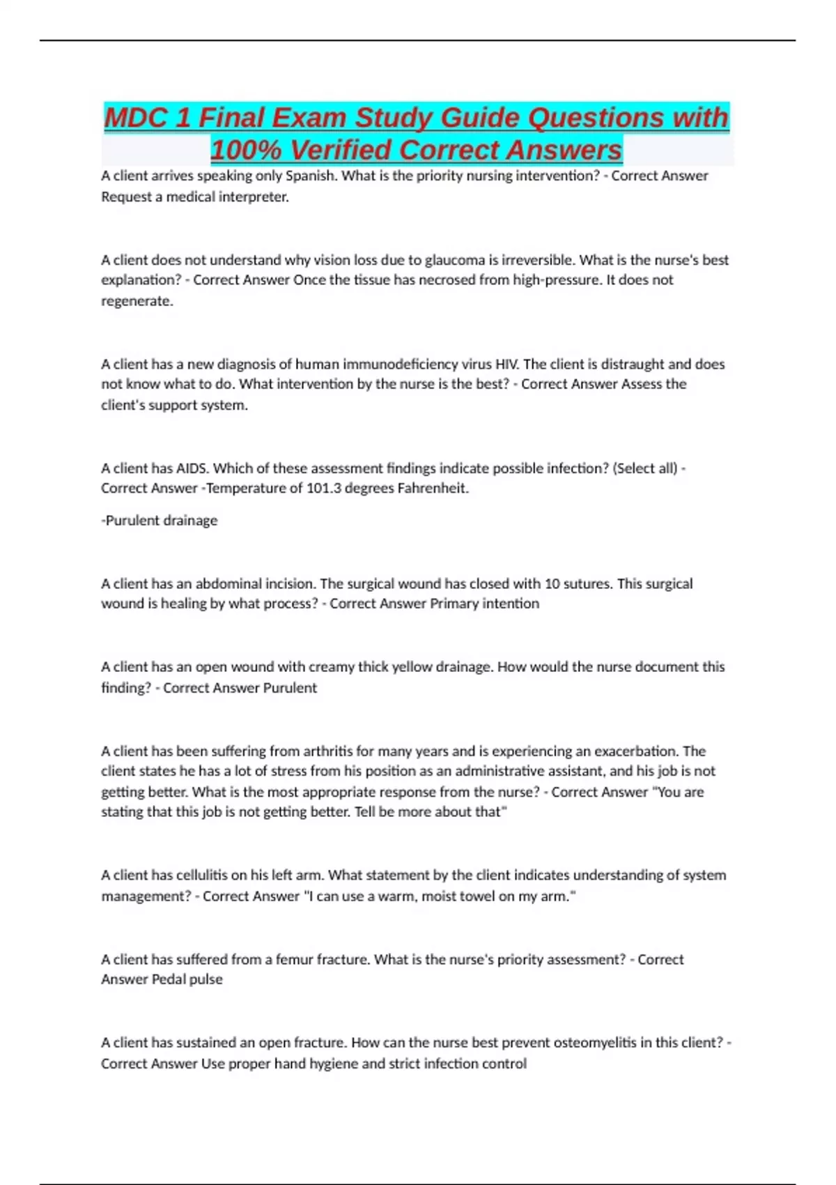 MDC 1 Final Exam Study Guide Questions with 100% Verified Correct Answers A client arrives speaking only Spanish. What is the priority nursing intervention? - Correct Answer Request a medical interpreter. A client does not understand why vision loss due to glaucoma is irreversible. What is the nurse's best explanation? - Correct Answer Once the tissue has necrosed from high-pressure. It does not regenerate. A client has a new diagnosis of human immunodeficiency virus HIV. The client is distraught and does not know what to do. What intervention by the nurse is the best? - Correct Answer Assess the client's support system. A client has AIDS. Which of these assessment findings indicate possible infection? (Select all) - Correct Answer -Temperature of 101.3 degrees Fahrenheit. -Purulent drainage A client has an abdominal incision. The surgical wound has closed with 10 sutures. This surgical wound is healing by what process? - Correct Answer Primary intention A client has an open wound with creamy thick yellow drainage. How would the nurse document this finding? - Correct Answer Purulent A client has been suffering from arthritis for many years and is experiencing an exacerbation. The client states he has a lot of stress from his position as an administrative assistant, and his job is not getting better. What is the most appropriate response from the nurse? - Correct Answer "You are stating that this job is not getting better. Tell be more about that" A client has cellulitis on his left arm. What statement by the client indicates understanding of system management? - Correct Answer "I can use a warm, moist towel on my arm." A client has suffered from a femur fracture. What is the nurse's priority assessment? - Correct Answer Pedal pulse A client has sustained an open fracture. How can the nurse best prevent osteomyelitis in this client? - Corr