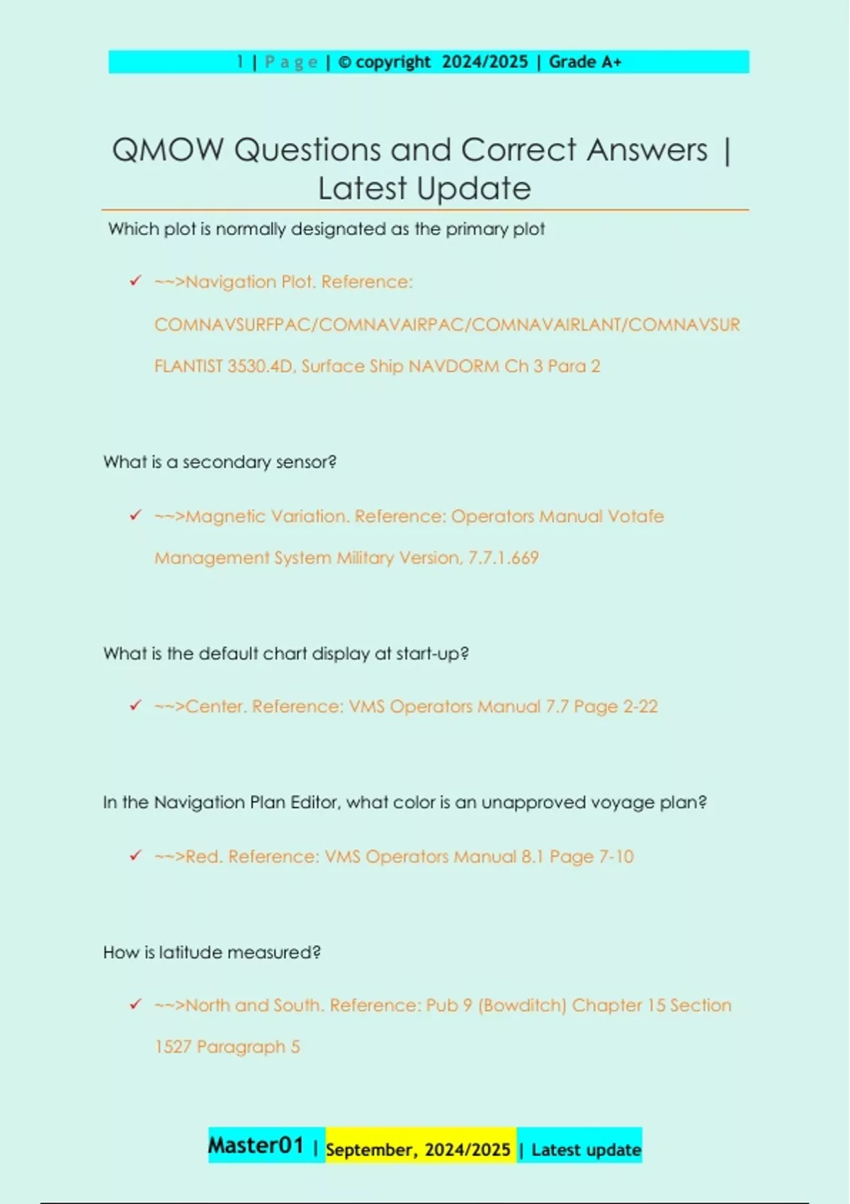 Which plot is normally designated as the primary plot ~~>Navigation Plot. Reference: COMNAVSURFPAC/COMNAVAIRPAC/COMNAVAIRLANT/COMNAVSUR FLANTIST 3530.4D, Surface Ship NAVDORM Ch 3 Para 2 What is a secondary sensor? ~~>Magnetic Variation. Reference: Operators Manual Votafe Management System Military Version, 7.7.1.669 What is the default chart display at start-up? ~~>Center. Reference: VMS Operators Manual 7.7 Page 2-22 In the Navigation Plan Editor, what color is an unapproved voyage plan? ~~>Red. Reference: VMS Operators Manual 8.1 Page 7-10 How is latitude measured? ~~>North and South. Reference: Pub 9 (Bowditch) Chapter 15 Section 1527 Paragraph 5 2 | P a g e | © copyright 2024/2025 | Grade A+ Master01 | September, 2024/2025 | Latest update What is a primary navigation sensor? ~~>Position. Reference: Operators Manual Voyage Management System Military Version, 7.7.1.669 Which two of the following are listed in the nautical almanac? ~~>Civil and Nautical Twilight. Reference Nautical Almanac What types of tides will occur when the moon is at first or third quarter phase? ~~>Neap. Reference: Pub9 (Bowditch) Chapter 9 Section 908 Paragraph 3 A sextant having an index error that is subtracted from each reading has a... ~~>Positive Correction. Reference: Pub 9 (Bowditch) Chapter 16 Section 1612 Paragraph 1 Your longitude is 179 59 degrees W. The LMT at this logitiude is 23h 56m on the 4th day of the month. Six (6) minutes later your position is 179 59 degrees E. What is your LMT and date at the new position? ~~>00h 02m on the 6th. Reference: Pub 9 (Bowditch) Chapter 18 Section 1805 Paragraph 1 3 | P a g e | © copyright 2024/2025 | Grade A+ Master01 | September, 2024/2025 | Latest update If a LOP fix update alarm is issued, display values will change to what color? ~~>Red. Reference: VMS Operator Manual 7.7 Page 12-17 The apparent wind can be zero when the true wind is from... ~~>Astern and equal to the ships speed. Reference: Pub 9 (Bowditch) How many LOPs cons