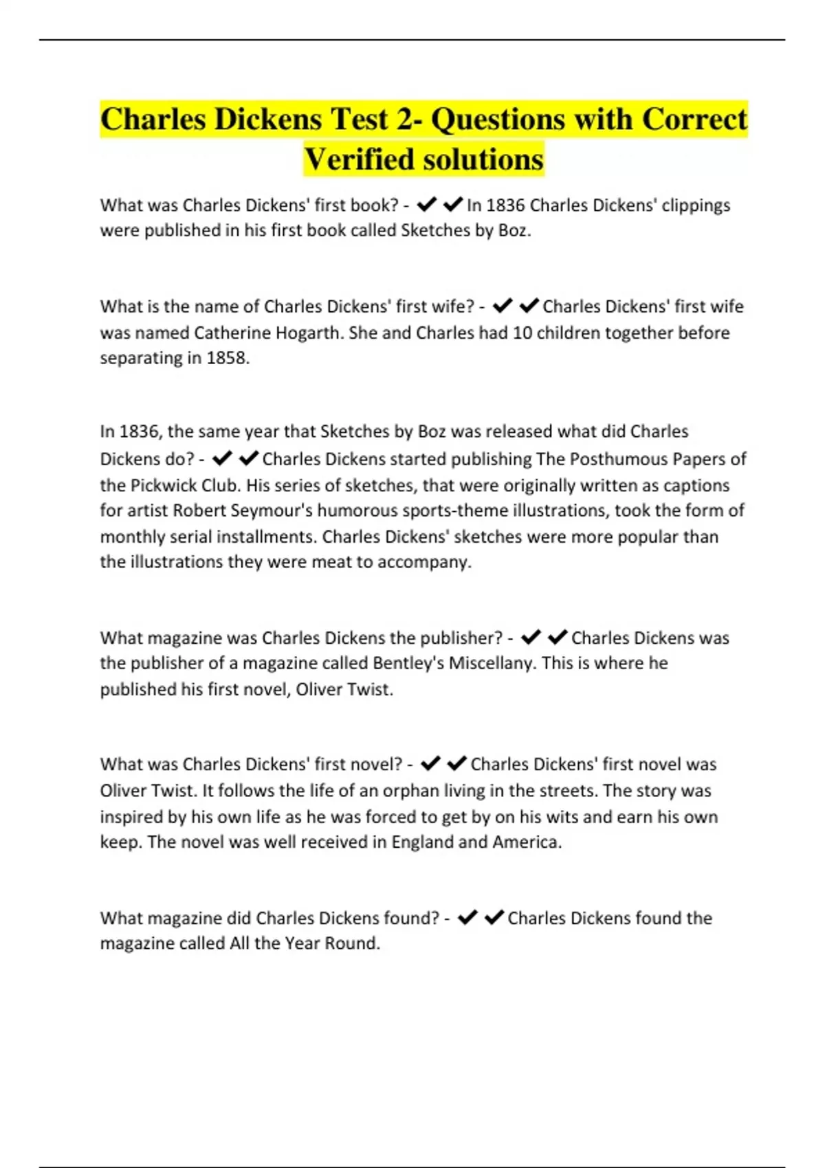 Charles Dickens Test 2- Questions with Correct
