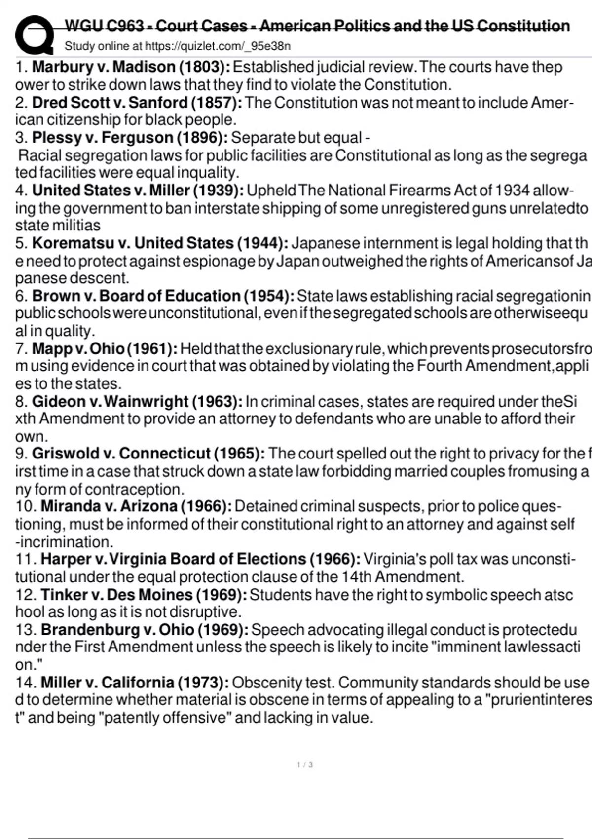 1. Marbury v. Madison (1803): Established judicial review. The courts have thep